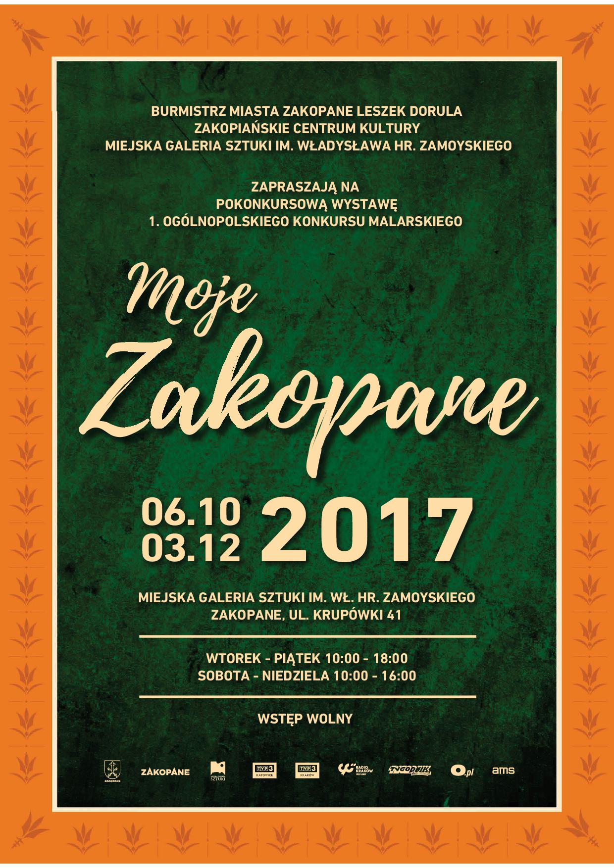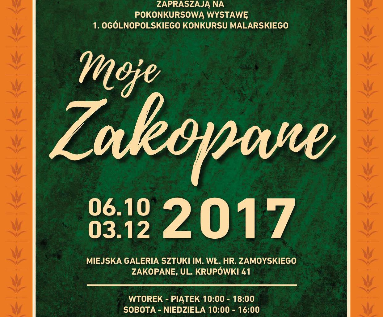 Burmistrz Miasta Zakopane Leszek Dorula, Zakopiańskie Centrum Kultury i Miejska Galeria Sztuki im. Wł. hr. Zamoyskiego zapraszają na pokonkursową wystawę 1. Ogólnopolskiego Konkursu Malarskiego "Moje Zakopane" od 6 października 2017. Wernisaż połączony z ceremonią wręczenia nagród odbędzie się 13 października 2017.