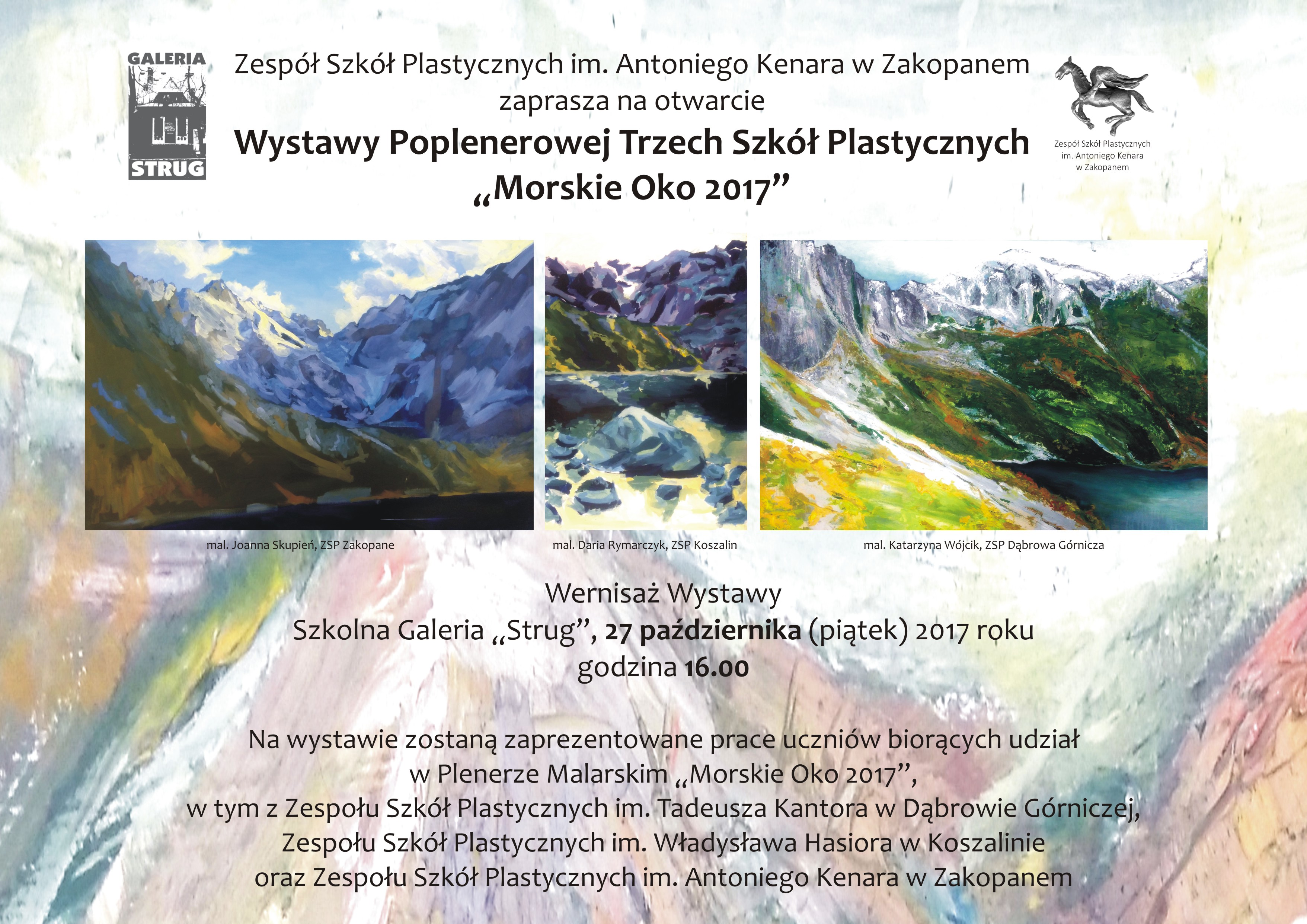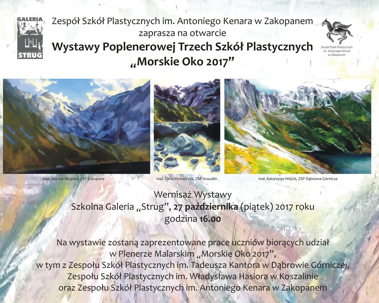 Zespół Szkół Plastycznych im. Antoniego Kenara zaprasza na otwarcie wystawy poplenerowej trzech szkół plastycznych "Morskie Oko 2017" do Szkolnej Galerii Strug 27 października o godz. 16.00.