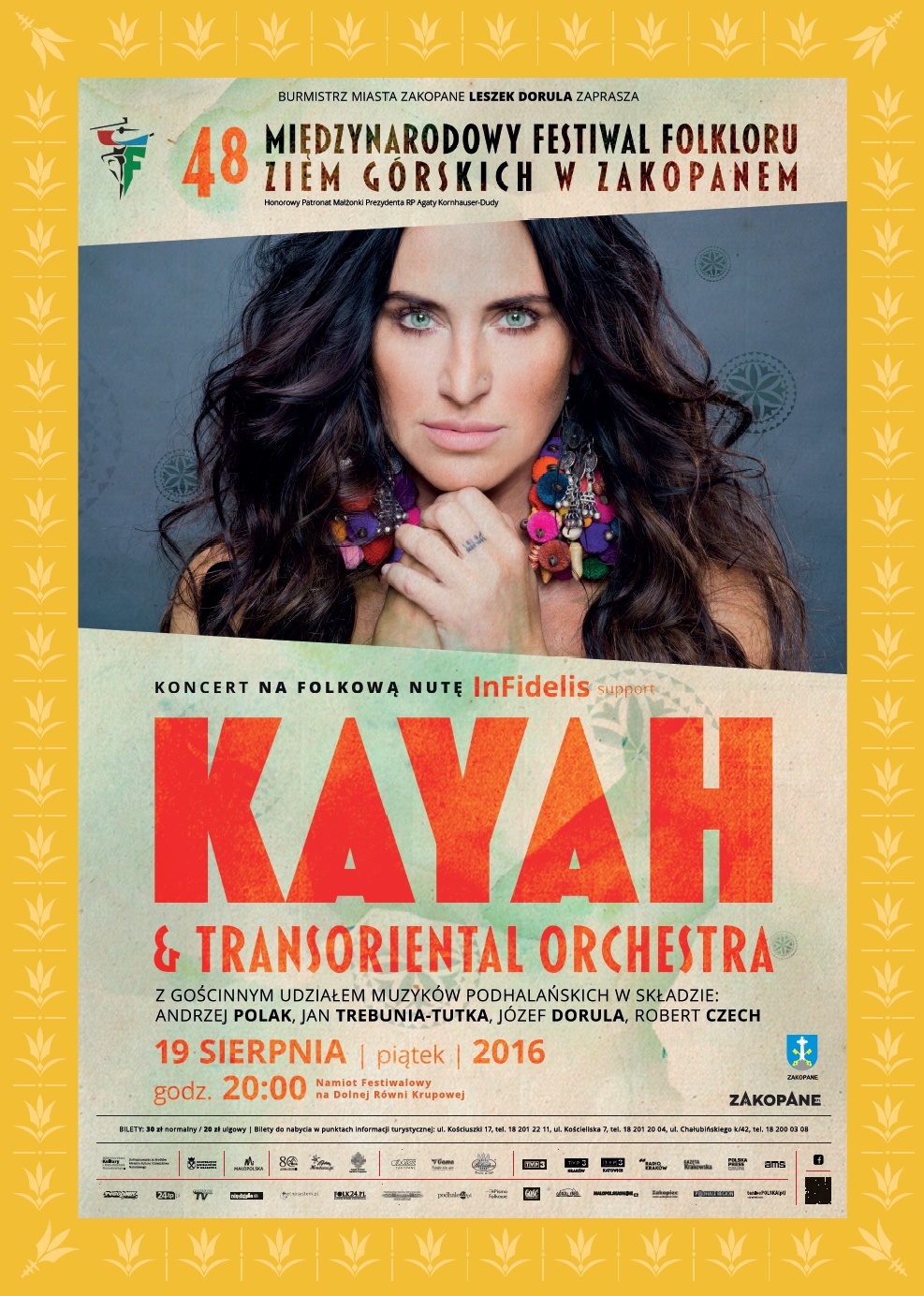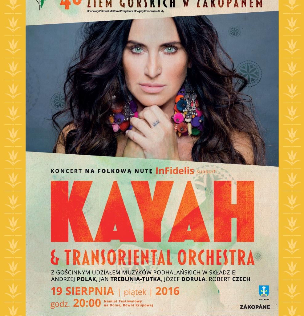 Stałym i wyczekiwanym punktem programu Międzynarodowego Festiwalu Folkloru Ziem Górskich jest zawsze koncert „Na Folkową Nutę”. W tym roku 19 sierpnia wystąpi w nim wyjątkowa gwiazda – Kayah z niezwykłym projektem Transoriental Orchestra, będącym efektem miłości wokalistki do muzyki world. Muzyczną ucztę wzbogaci gościnny udział podhalańskich muzyków: Andrzeja Polaka, Jana Trebuni-Tutki, Józefa Doruli i Roberta Czecha. Jako suport wystąpi zaskakujący ciekawym instrumentarium duet InFidelis.