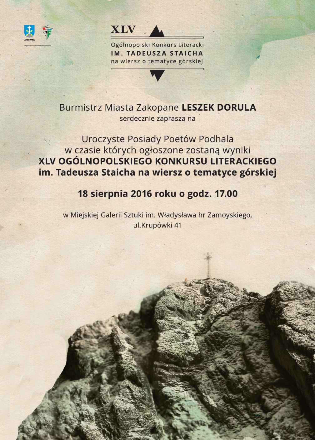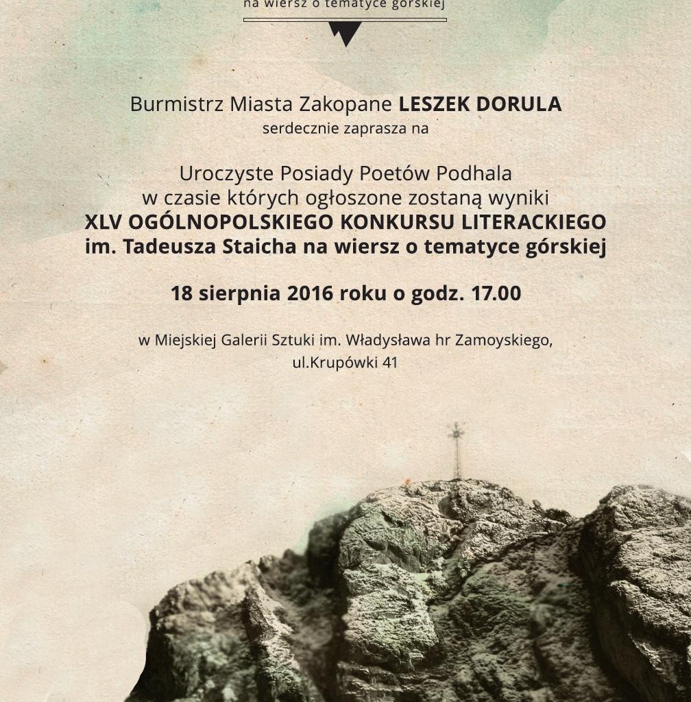 Burmistrz Miasta Zakopane Leszek Dorula 18 sierpnia o godz. 17.00 zaprasza do Miejskiej Galerii Sztuki na Uroczyste Posiady Poetów Podhala, podczas których ogłoszone zostaną wyniki 45. Jubileuszowego Ogólnopolskiego Konkursu Literackiego im. Tadeusza Staicha na wiersz o tematyce górskiej.