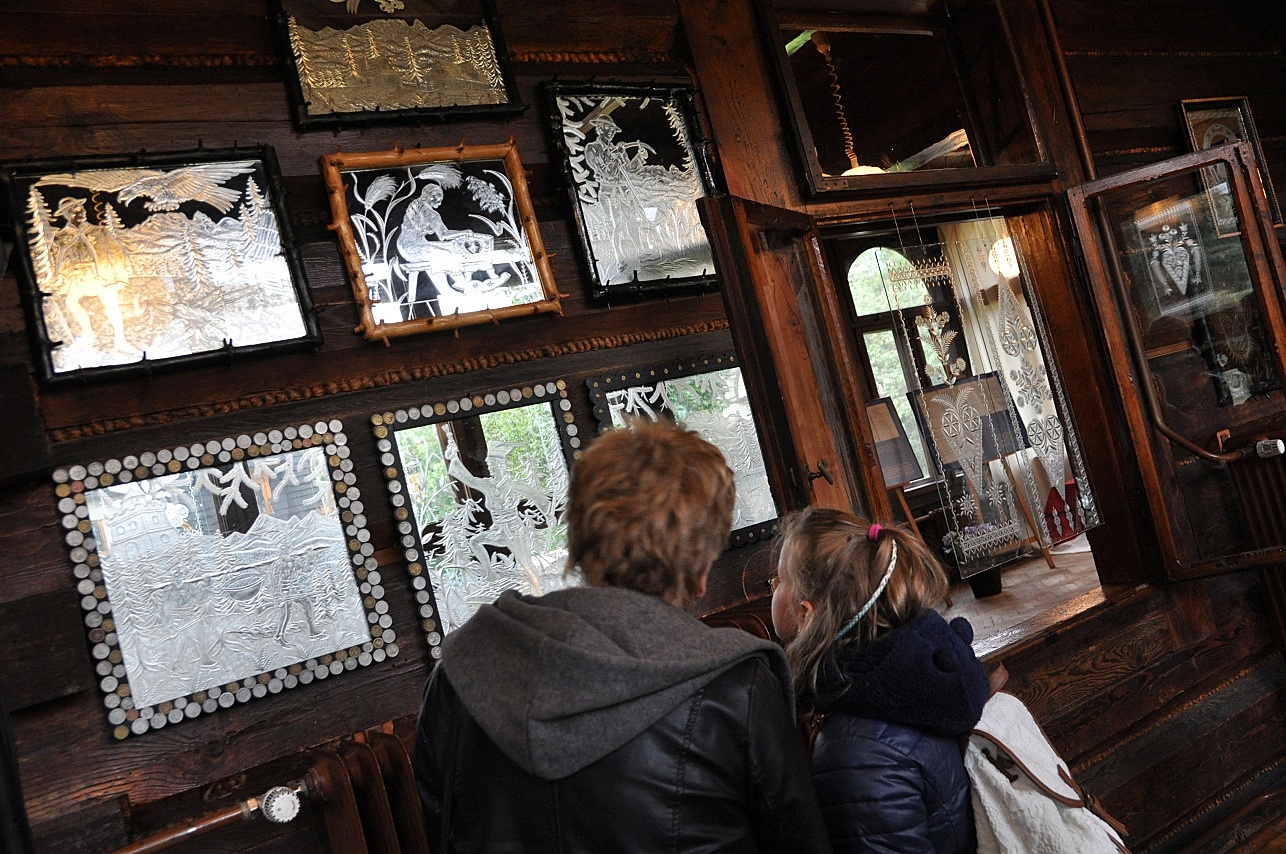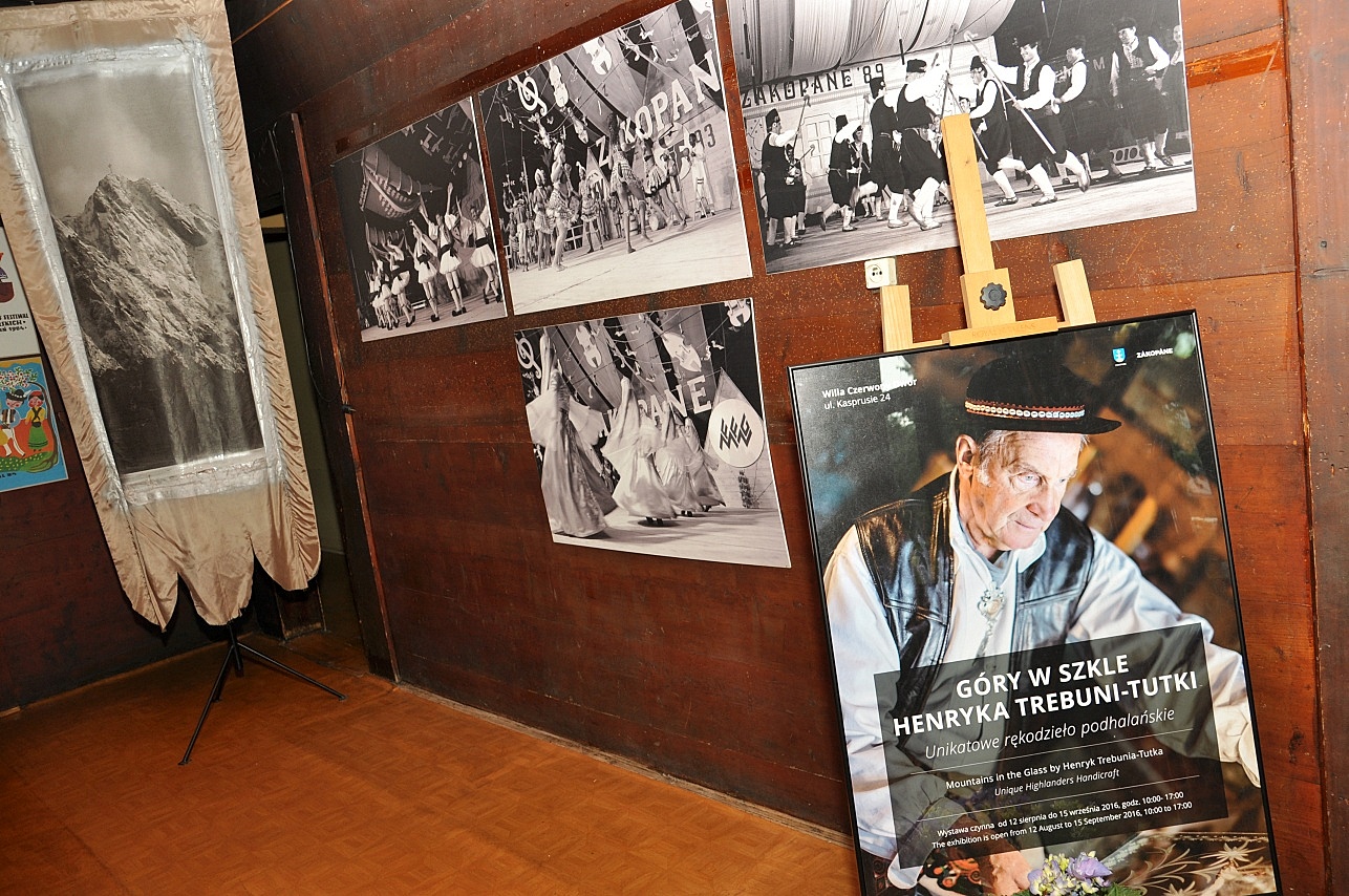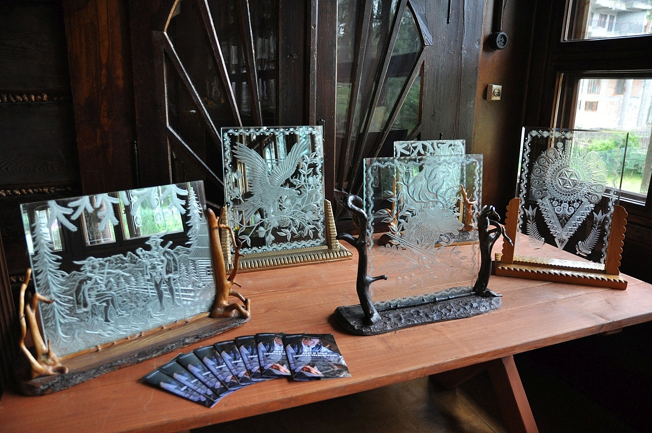 Prezentowana w pięknych zabytkowych wnętrzach rzeźba w szkle wykonywana jest obecnie przez jednego tylko artystę Henryka Trebunię-Tutkę – znanego twórcę ludowego, muzykanta i rękodzielnika. Stosowana przez niego technika rzeźbienia przy pomocy twardych kamieni szlifierskich jest trudna i wymaga precyzji oraz doskonałego wyobrażenia o projektowanym wzorze. W swojej twórczości artysta wykorzystuje motywy podhalańskie, takie jak: parzenica, leluja, rozeta, dziewięćsił. Ukazuje tatrzańską roślinność, krajobrazy, zwierzęta. Charakterystyczne dla jego prac są również sceny rodzajowe z życia górali. Artysta podczas wernisażu zagrał także wraz z muzyką w rodzinnym składzie Trebuniów-Tutków.