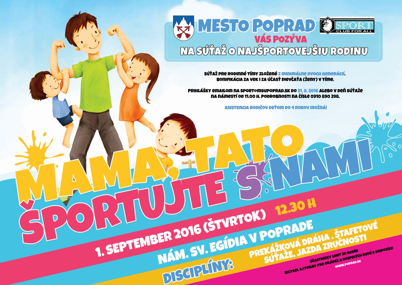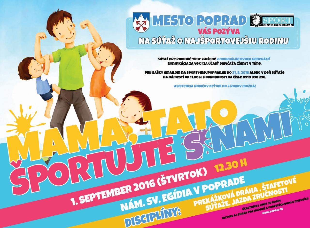 Miasto Poprad we współpracy z partnerami organizuje 1 września 2016 serię wydarzeń sportowych. Dla biegaczy przygotowane są imprezy Podtatranský polmaraton oraz Primátorská desiatka, dla miłośników Nordic walkingu zawody na 10 i 21 km. Częścią tego wydarzenia jest konkurs dla rodzin z dziećmi nazwany "MAMO, TATO, UPRAWIAJCIE SPORT Z NAMI".