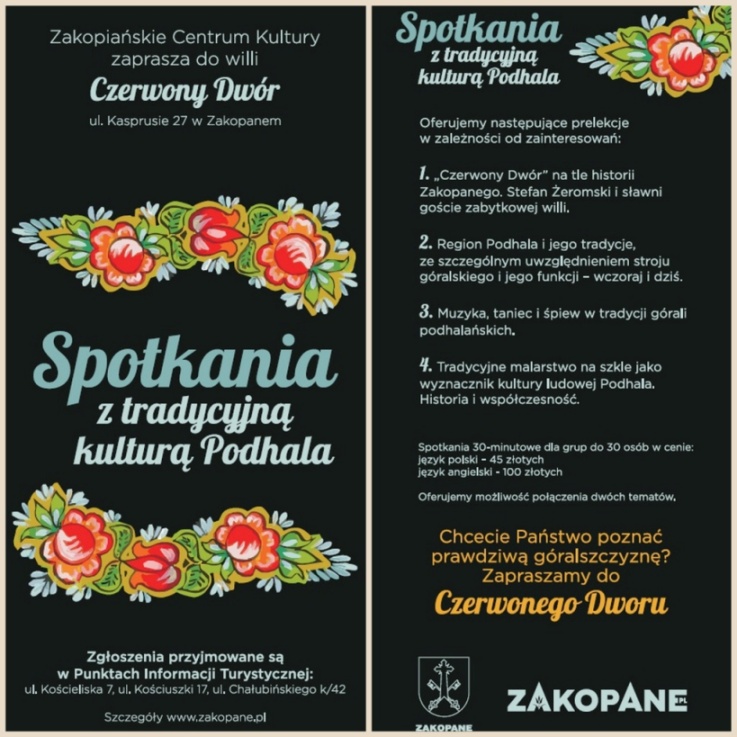 Zakopiańskie Centrum Kultury zaprasza do willi Czerwony Dwór, ul. Kasprusie 27 w Zakopanem na Spotkania z tradycyjną kulturą Podhala.