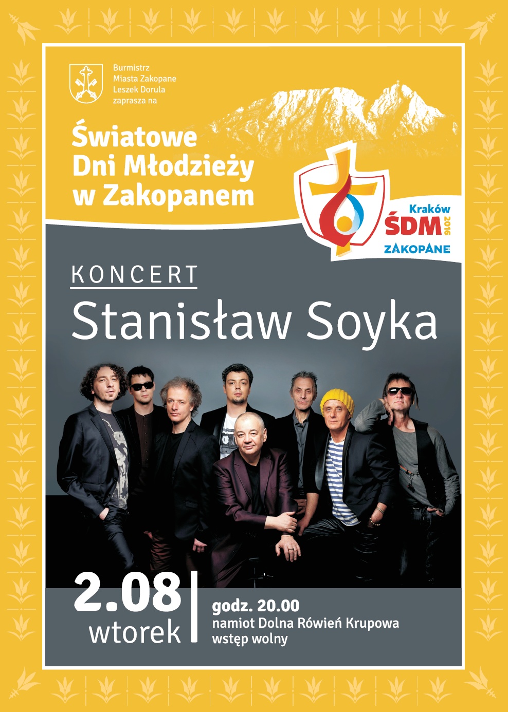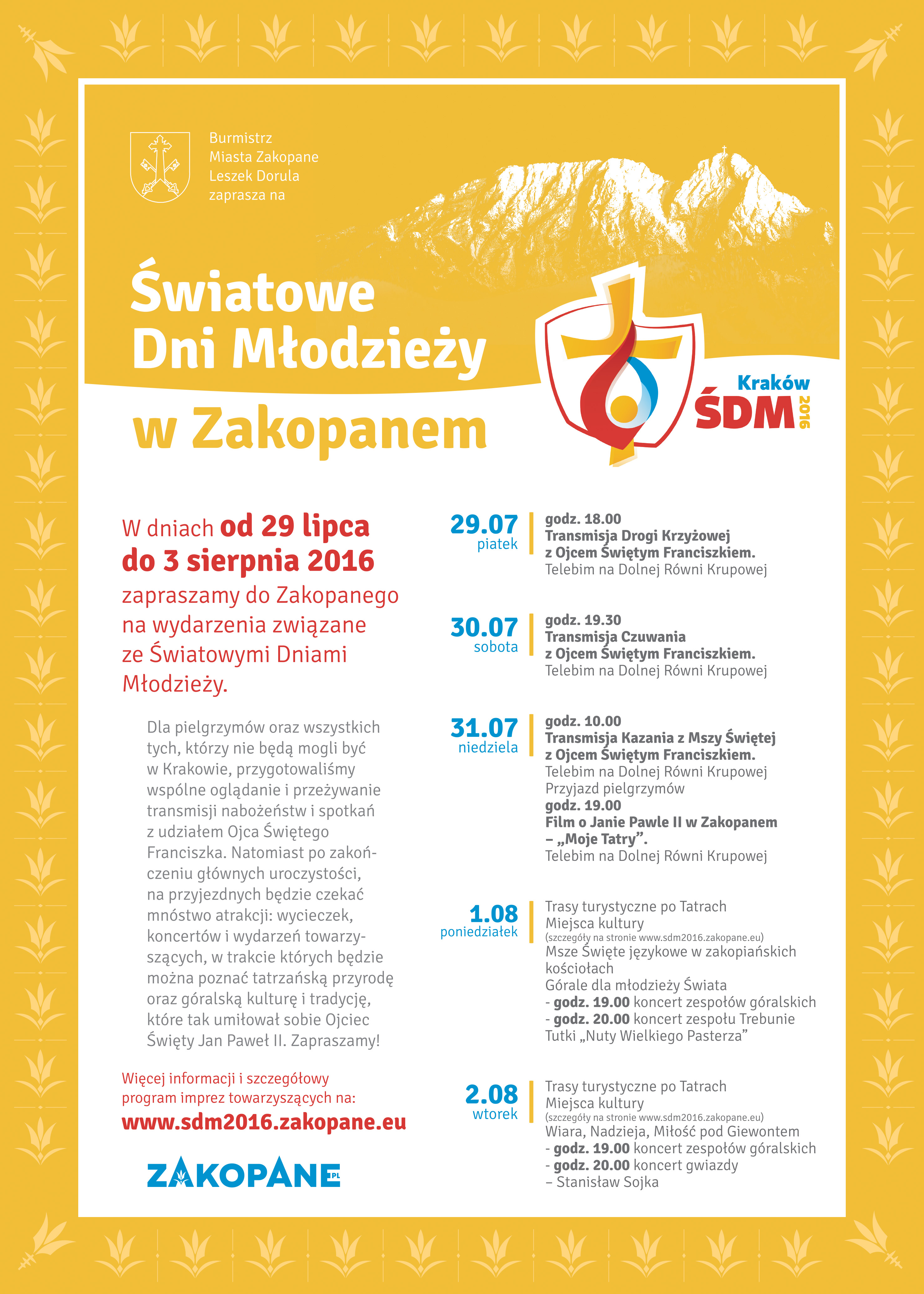 Burmistrz Miasta Zakopane w dniach 29 lipca do 3 sierpnia serdecznie zaprasza na wydarzenia Światowych Dni Młodzieży do Zakopanego. Dla osób, które nie będą mogły wybrać się do Krakowa, miasto przygotowuje wspólne oglądanie i przeżywanie transmisji nabożeństw i spotkań z udziałem Ojca Świętego Franciszka. Natomiast bezpośrednio po zakończeniu głównych uroczystości z pewnością wielu pielgrzymów zdecyduje się na przedłużenie pobytu właśnie w Zakopanem. Dla nich organizatorzy zadbali o ciekawy program, na który złożą się wycieczki, koncerty i wydarzenia towarzyszące.