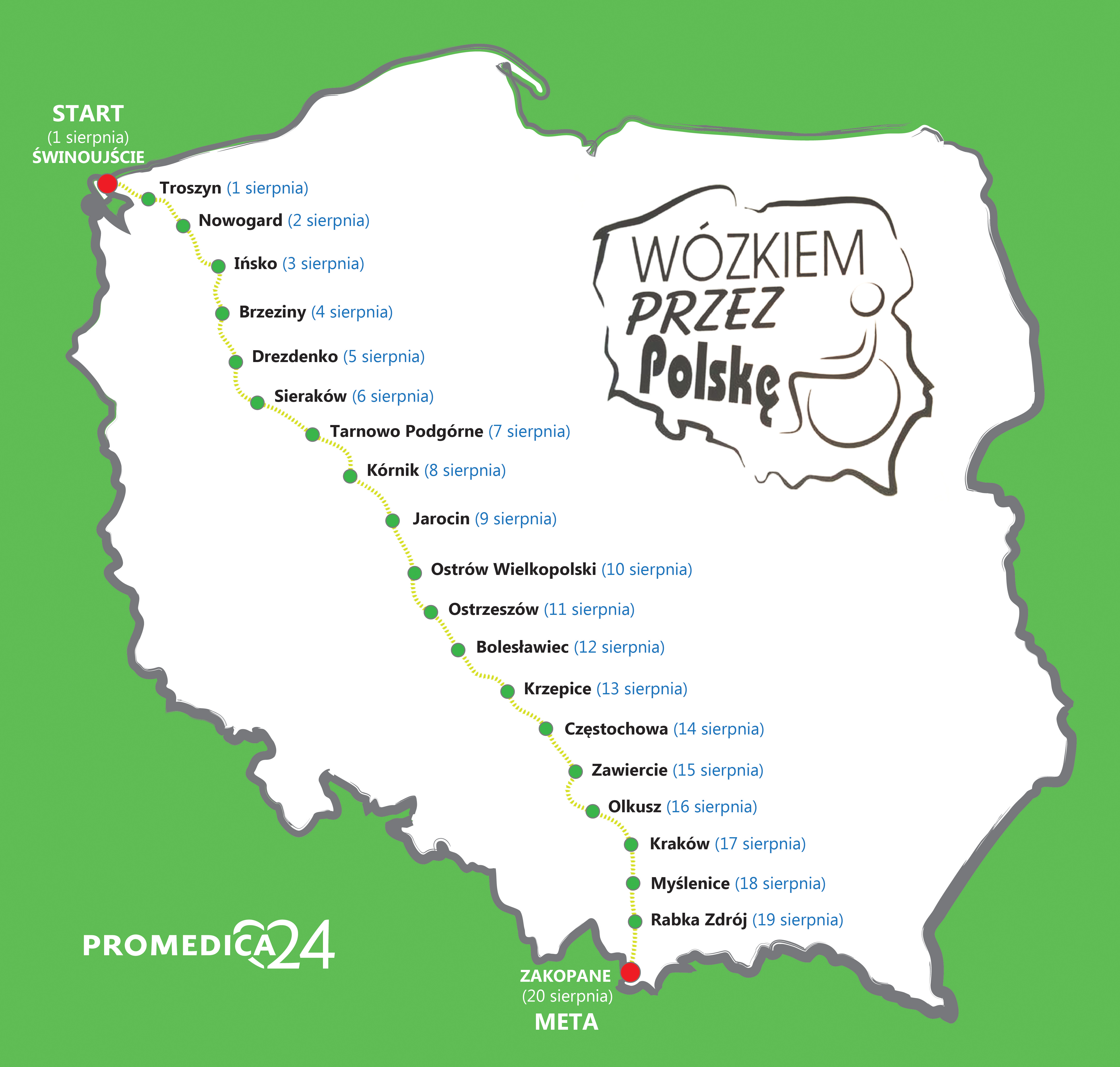 Pomysł wyprawy w Polskę narodził się w głowie Bartka mniej więcej dwa lata temu, podczas wędrówek po okolicach Świnoujścia. Jak sam mówi, długie rozmowy z towarzyszącymi mu na rowerach wolontariuszami Caritasu (jeden ze współorganizatorów i partnerów wyprawy) oraz członkami Świnoujskiej Inicjatywy Rowerowej (tzw. Świry, doskonale znani mieszkańcom nadmorskiego kurortu), zaowocowały pomysłem na przejechanie z rodzinnego Świnoujścia na Podhale. Bartek wyruszył w trasę 1 sierpnia, a uroczysty start nastąpił z Placu Słowiańskiego w Świnoujściu. W ciągu niecałych trzech tygodni przejechał przez sześć województw, zatrzymując się na nocleg w miastach, w których kończyły się kolejne etapy. Trasa wyprawy objęła Świnoujście, Nowogard, Ińsko, Brzeziny, Drezdenko, Sieraków, Tarnowo Podgórne, Kórnik, Jarocin, Ostrów Wlkp., Ostrzeszów, Bolesławiec, Częstochowę, Zawiercie, Olkusz, Kraków, Myślenice, Rabkę Zdrój i Zakopane.