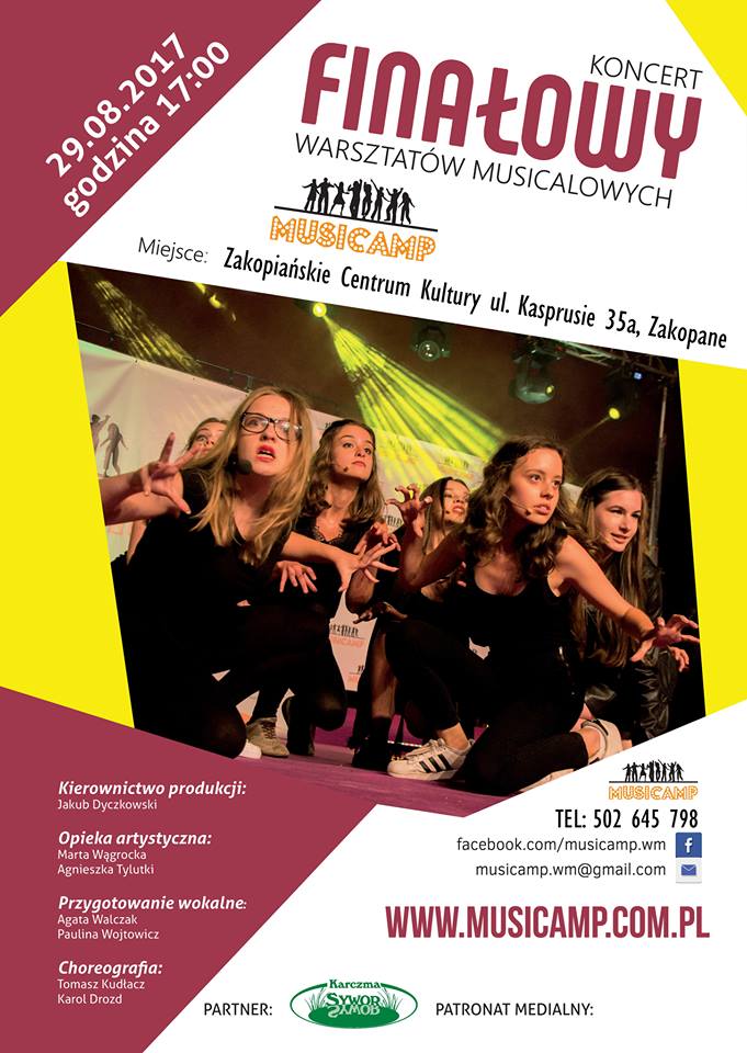 29 sierpnia o godz. 17.00 w Zakopiańskim Centrum Edukacji, ul. Kasprusie 35 a, odbędzie się wielki koncert finałowy kończący IX Warsztaty Musicalowe MUSICAMP.