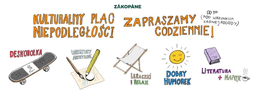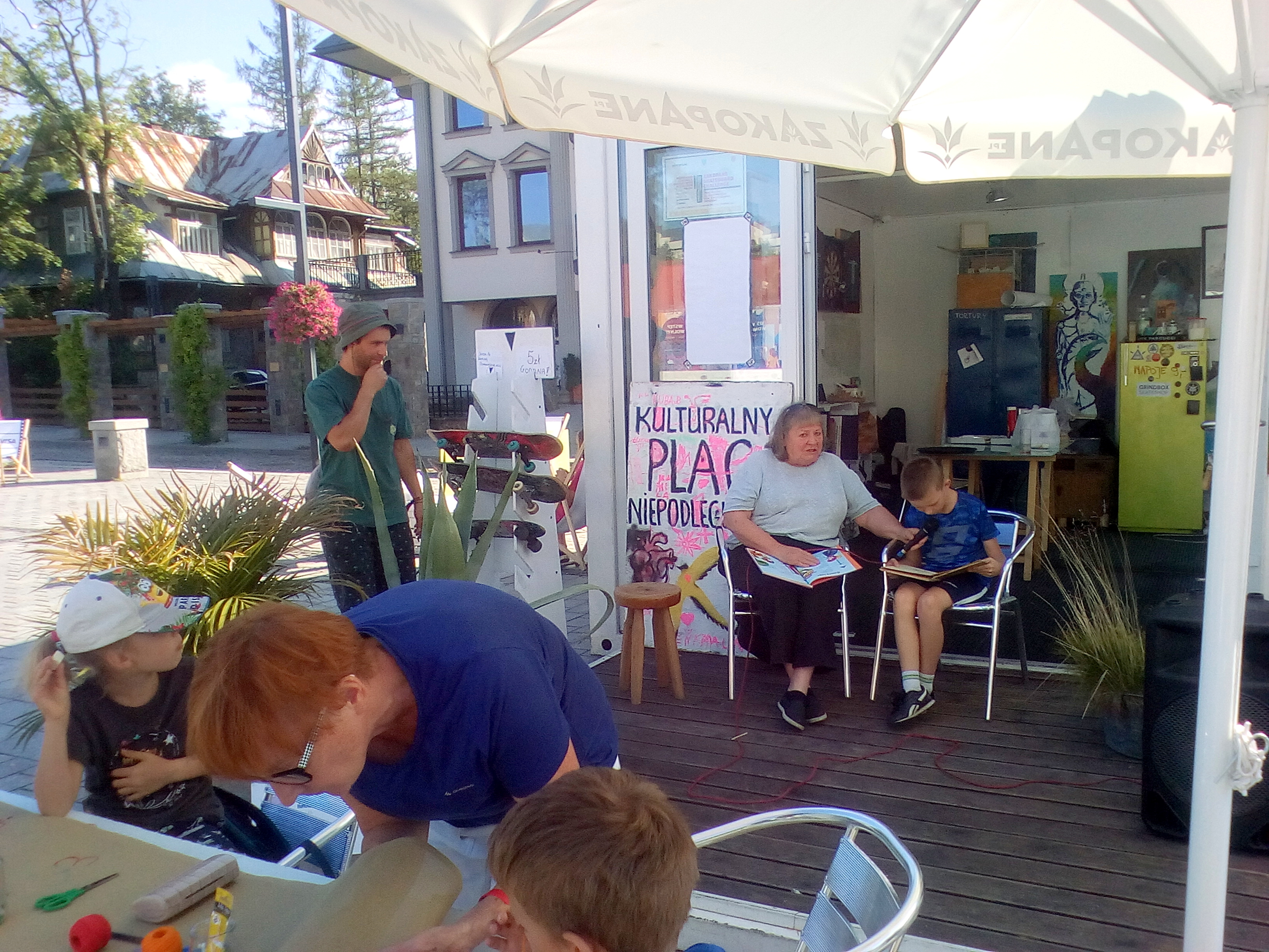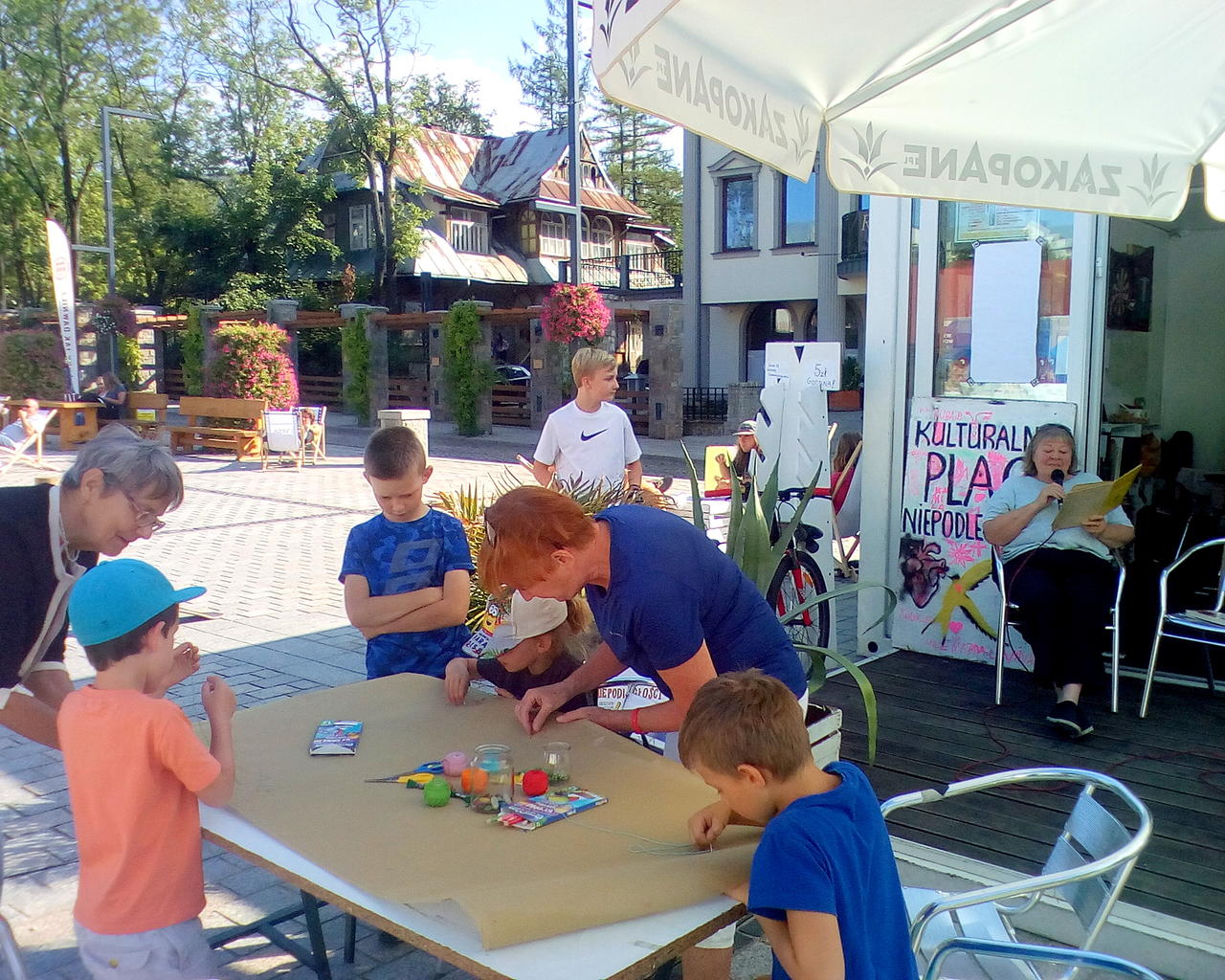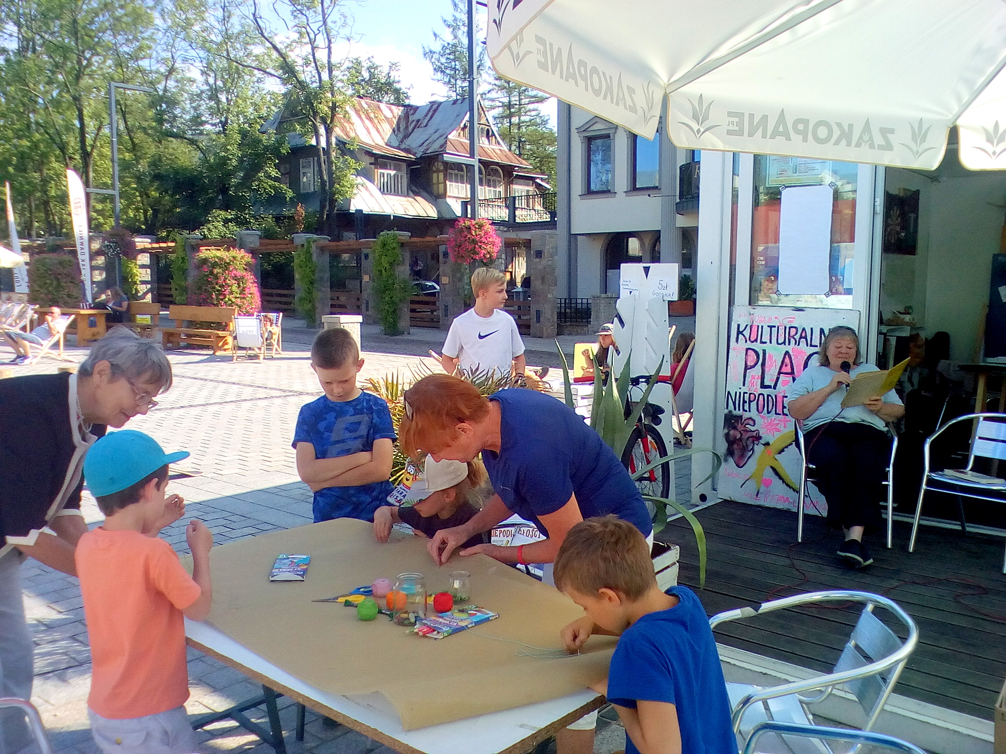 Wtorkowe popołudnie na Kulturalnym Placu Niepodległości upłynęło pod znakiem wspólnego wyszywania i rysowania Kulturalnego Obrusu, który pozostanie w tutejszej świetlicy. W otwartych i bezpłatnych warsztatach mógł brać udział każdy, kto chciał udekorować fragment obrusu przez wyszywanie, przyszywanie łat lub guzików. Zajęcia plastyczne odbywały się w towarzystwie najpiękniejszych wierszy Jana Brzechwy, czytanych przez niezawodne Słuchaczki Podhalańskiego Uniwersytetu Trzeciego Wieku, które regularnie co czwartek czytają na placu "Przygody Kubusia Puchatka".