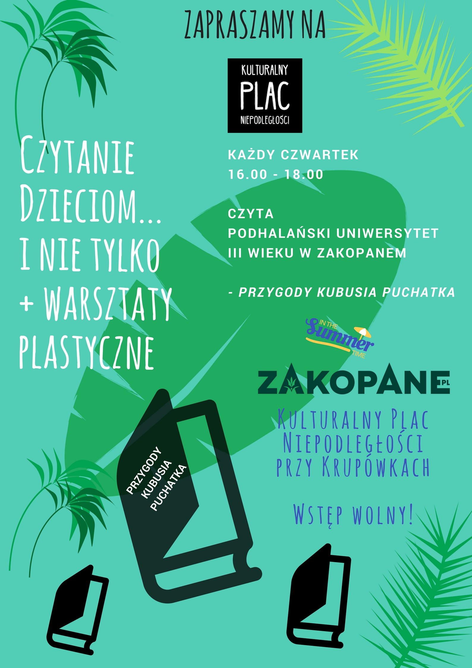 Wychodząc więc naprzeciw Waszym oczekiwaniom, również w te wakacje, Burmistrz Miasta Zakopane Leszek Dorula, za pośrednictwem Zakopiańskiego Centrum Kultury, postanowił przeznaczyć i częściowo zaaranżować Plac Niepodległości właśnie dla Was, oddając wolne pole, abyście sami mogli zadecydować jak chcecie je wykorzystać, jak zaaranżować, co zaprezentować, zobaczyć lub czego się nauczyć.
