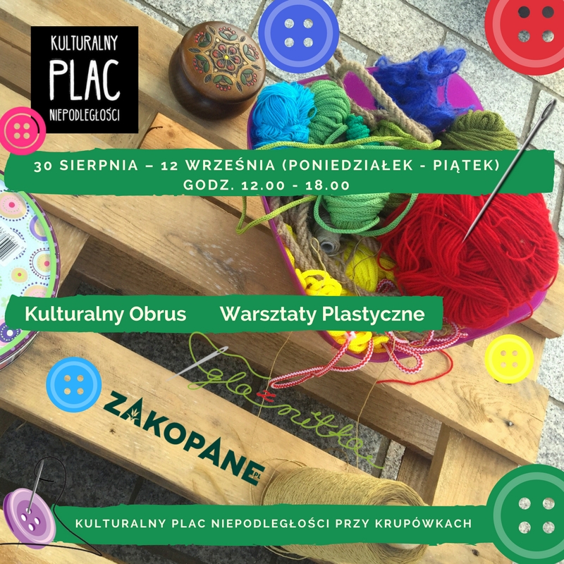 Wspólnie stworzymy Kulturalny Obrus, który pozostanie na Kulturalnym Placu Niepodległości. Warsztaty przeznaczone są dla wszystkich tych małych i tych większych. Każdy z uczestników będzie mógł udekorować fragment obrusu przez wyszywanie, przyszywanie łat i guzików. Wszystko to odbędzie się w towarzystwie najpiękniejszych wierszy Jana Brzechwy, czytanych przez Panie z Podhalańskiego Uniwersytetu Trzeciego Wieku.