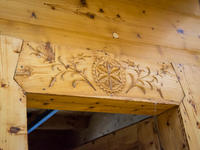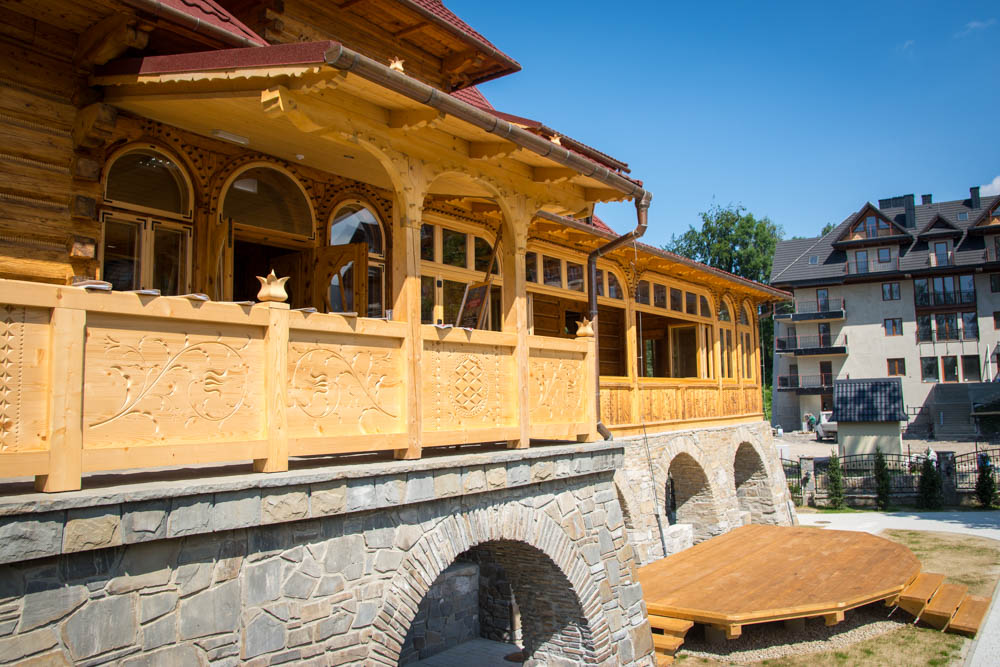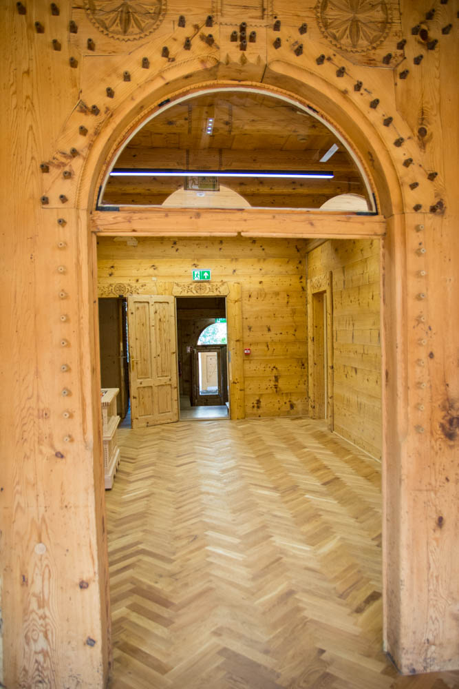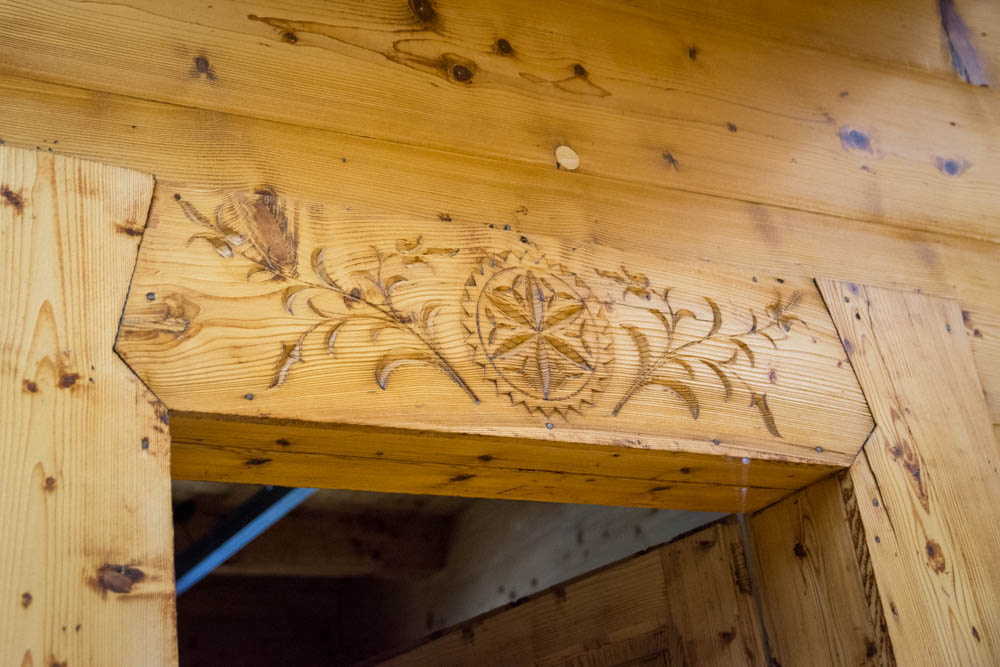 Oryginalne ściany i sufity oczyszczone zostały wykorzystując technologię piaskowania strumieniowego, przy pomocy drobnego wiślanego piasku, dzięki czemu udało się przywrócić naturalny kolor drewna i wydobyć rzeźbione zdobienia.