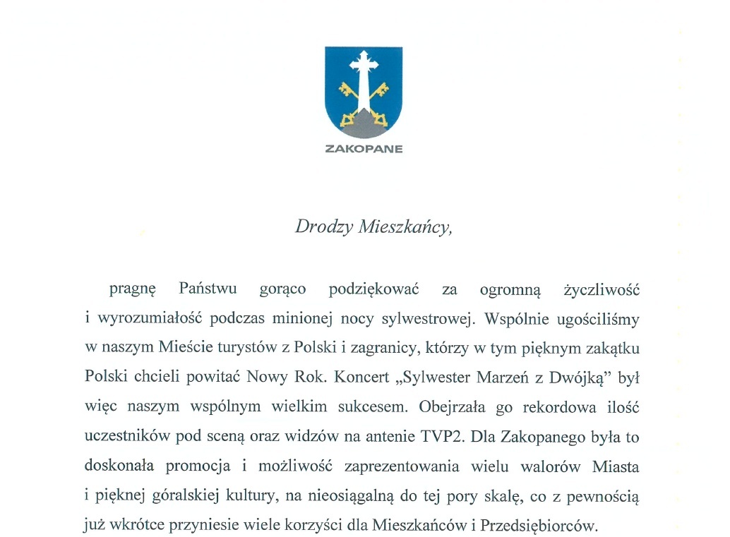 Drodzy Mieszkańcy, pragnę Państwu gorąco podziękować za ogromną życzliwość i wyrozumiałość podczas minionej nocy sylwestrowej. Wspólnie ugościliśmy w naszym Mieście turystów z Polski i zagranicy, którzy w tym pięknym zakątku Polski chcieli powitać Nowy Rok. Koncert „Sylwester Marzeń z Dwójką” był więc naszym wspólnym wielkim sukcesem.
