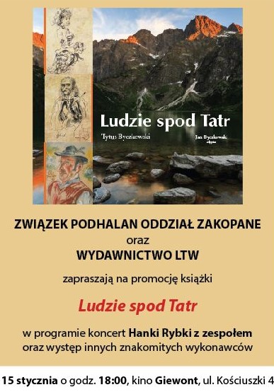 Związek Podhalan oddział Zakopane oraz Wydawnictwo LTW zapraszają na promocję książki "Ludzie spod Tatr". W programie koncert Hanki Rybki z zespołem oraz występ  innych znakomitych wykonawców. 15 stycznia o godz. 18.00 w Kinie Giewont, ul. Kościuszki 4.