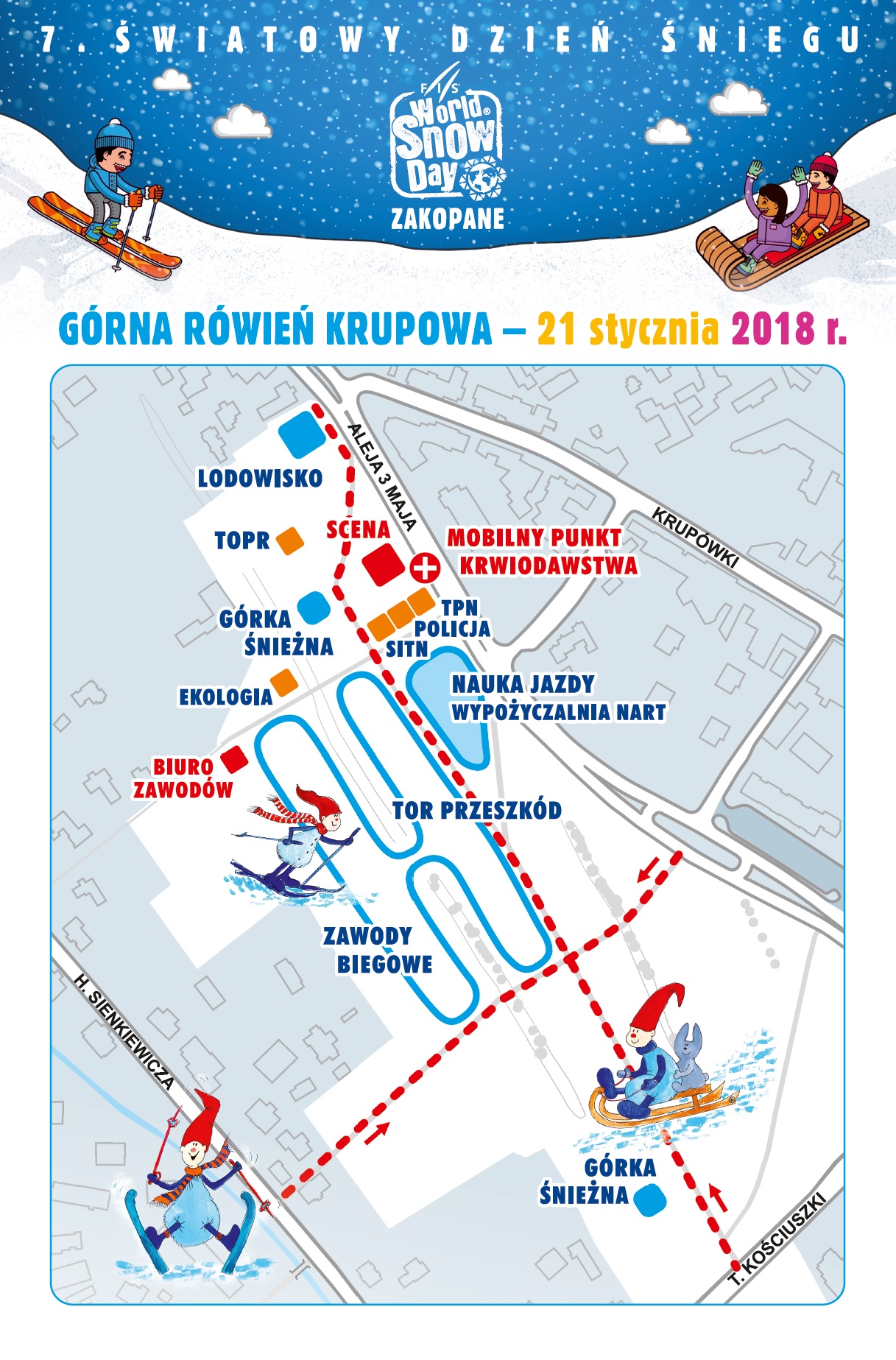 Godz. 10.00 – oficjalne otwarcie Światowego Dnia Śniegu – Burmistrzowie Leszek Dorula, Agnieszka Nowak Gąsienica, Wiktor Łukaszczyk, Pani Naczelnik Zofia Kiełpińska ze wspólnym odśpiewaniem piosenki World Snow Day napisanej przez P. Marka Kota wraz z zespołem regionalnym „Skibowiańskie Zwyrtliki”