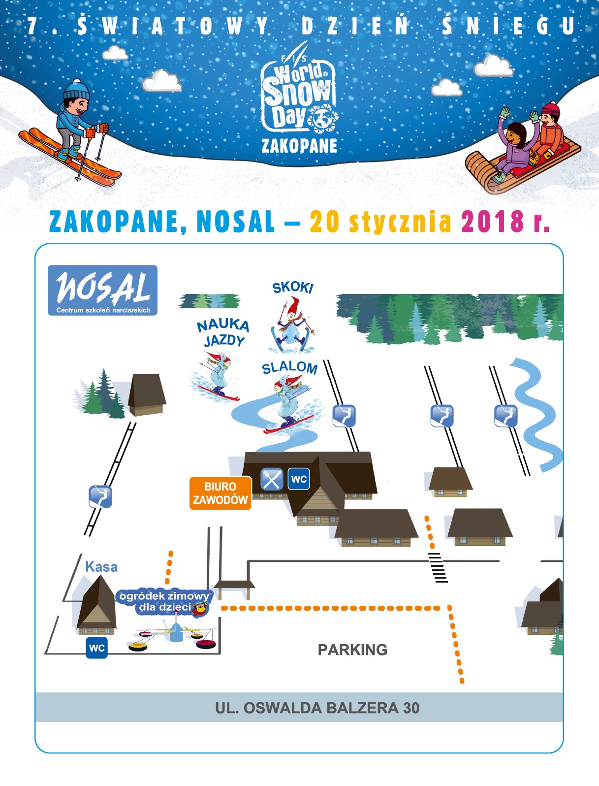WORLD SNOW DAY, czyli Światowy Dzień Śniegu, jest częścią Kampanii Międzynarodowej Federacji Narciarskiej (FIS) zatytułowanej "Bring Children to the Snow", mającej na celu promowanie nie tylko zabawy na śniegu, ale również edukacji związanej ze śniegiem. Wielkie święto z każdym rokiem przyciąga coraz więcej sympatyków, podczas obecnej edycji 20 stycznia 2018 r. (sobota) w Centrum Szkoleń Narciarskich NOSAL zorganizowane zostaną wieczorne zawody w narciarstwie alpejskim oraz w skokach narciarskich. Chcemy, aby nasze dzieci poczuły się jak profesjonalni zawodnicy, którzy często startują przy sztucznym świetle i muszą doświadczać różnych warunków na stoku. Chętni zawodnicy będą mogli skorzystać również z darmowej nauki jazdy na nartach zjazdowych. W dniu zawodów na uczestników czekać będzie także zjazd na nartach z pochodniami, a w dniu 21 stycznia 2018 r. (niedziela) na Górnej Równi Krupowej rozegrane zostaną zawody w narciarstwie biegowym. Każdy uczestnik zabaw oraz zawodów otrzyma złoty medal uczestnictwa w Światowym Dniu Śniegu.