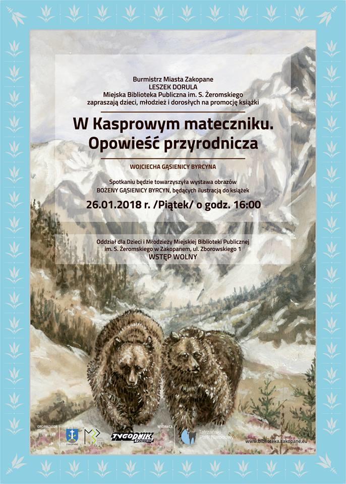 Burmistrz Miasta Zakopane Leszek Dorula i Miejska Biblioteka Publiczna im. Stefana Żeromskiego zapraszają dzieci, młodzież oraz dorosłych na promocję książki Wojciecha Gąsienicy-Byrcyna pt. „W Kasprowym mateczniku. Opowieść przyrodnicza”. Spotkaniu będzie towarzyszyła wystawa obrazów Bożeny Gąsienicy-Byrcyn, będących ilustracją do książek.