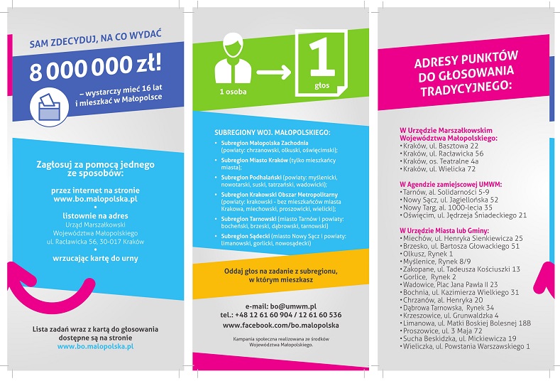 Masz ciekawy pomysł na co wydać publiczne pieniądze, by dobrze służyły mieszkańcom regionu? Nie czekaj i już dziś zgłoś swój projekt w 3. edycji Budżetu Obywatelskiego Województwa Małopolskiego. Do zagospodarowania jest aż 8 mln zł! To łatwiejsze niż myślisz, liczy się przede wszystkim kreatywność i odrobina chęci. Jeśli Twój projekt wygra głosowanie to Urząd Marszałkowski zrealizuje to zadanie lub powierzy jego wykonanie organizacji pozarządowej.