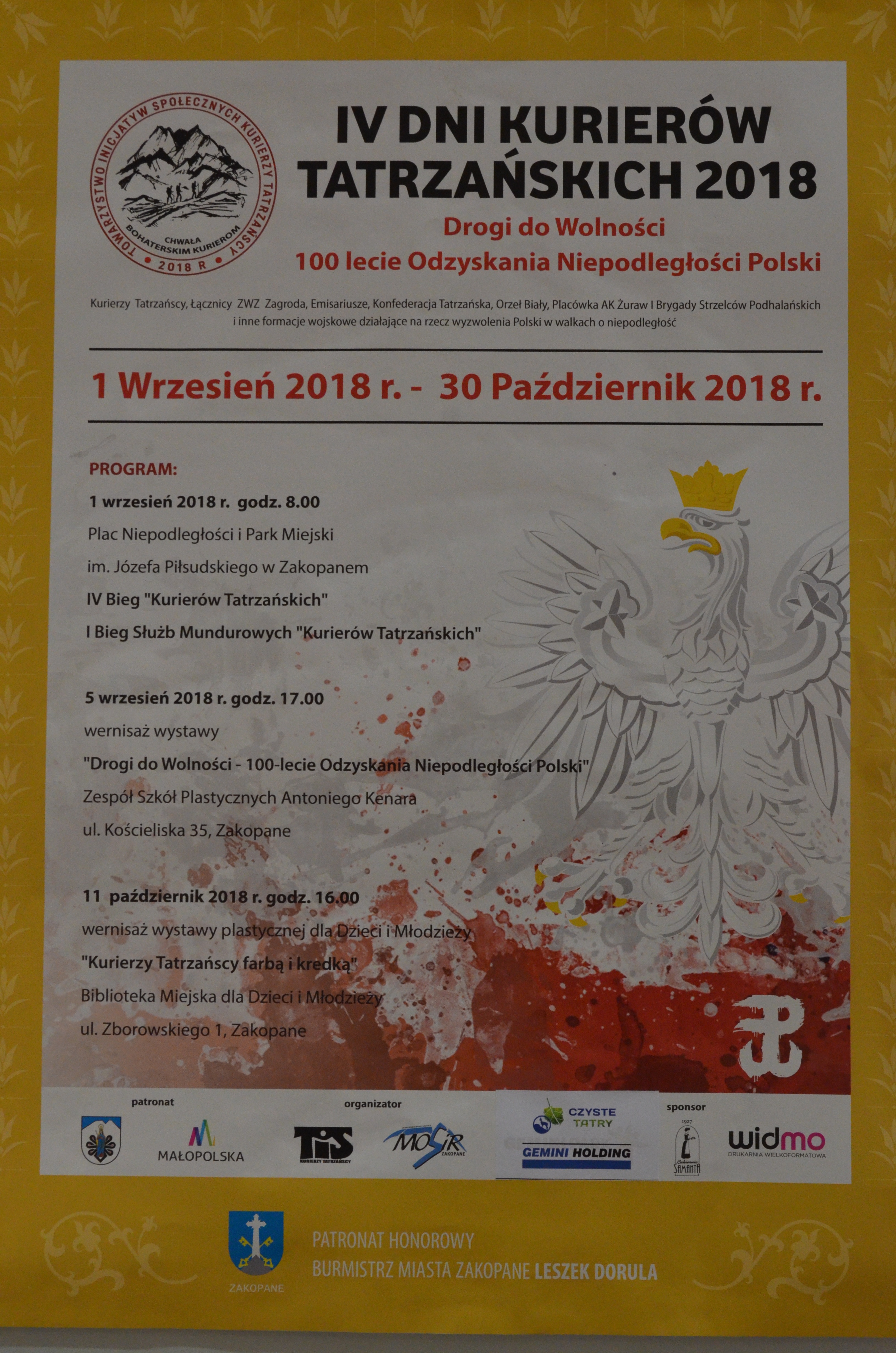 W ramach IV Dni Kurierów Tatrzańskich, 5 września w Zespole Szkół Plastycznych im. Antoniego Kenara odbył się wernisaż wystawy "Drogi do wolności - 100-lecie Niepodległości Polski".