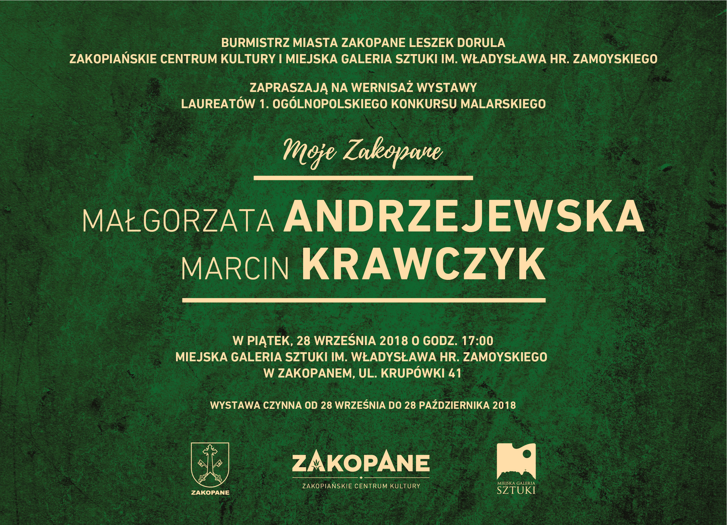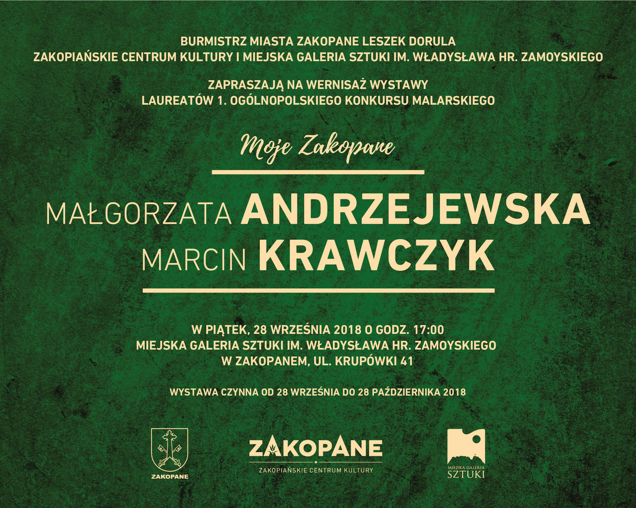 Burmistrz Miasta Zakopane Leszek Dorula, Zakopiańskie Centrum Kultury oraz Miejska Galeria Sztuki im. Władysława Hr. Zamoyskiego zapraszają serdecznie na wystawę malarstwa Małgorzaty Andrzejewskiej i Marcina Krawczyka – laureatów 1. Ogólnopolskiego Konkursu Malarskiego „Moje Zakopane”, który odbył się w Miejskiej Galerii Sztuki w 2017 roku, prezentując wielowątkowość spojrzenia na Zakopane z różnych perspektyw twórczych, estetycznych i emocjonalnych.