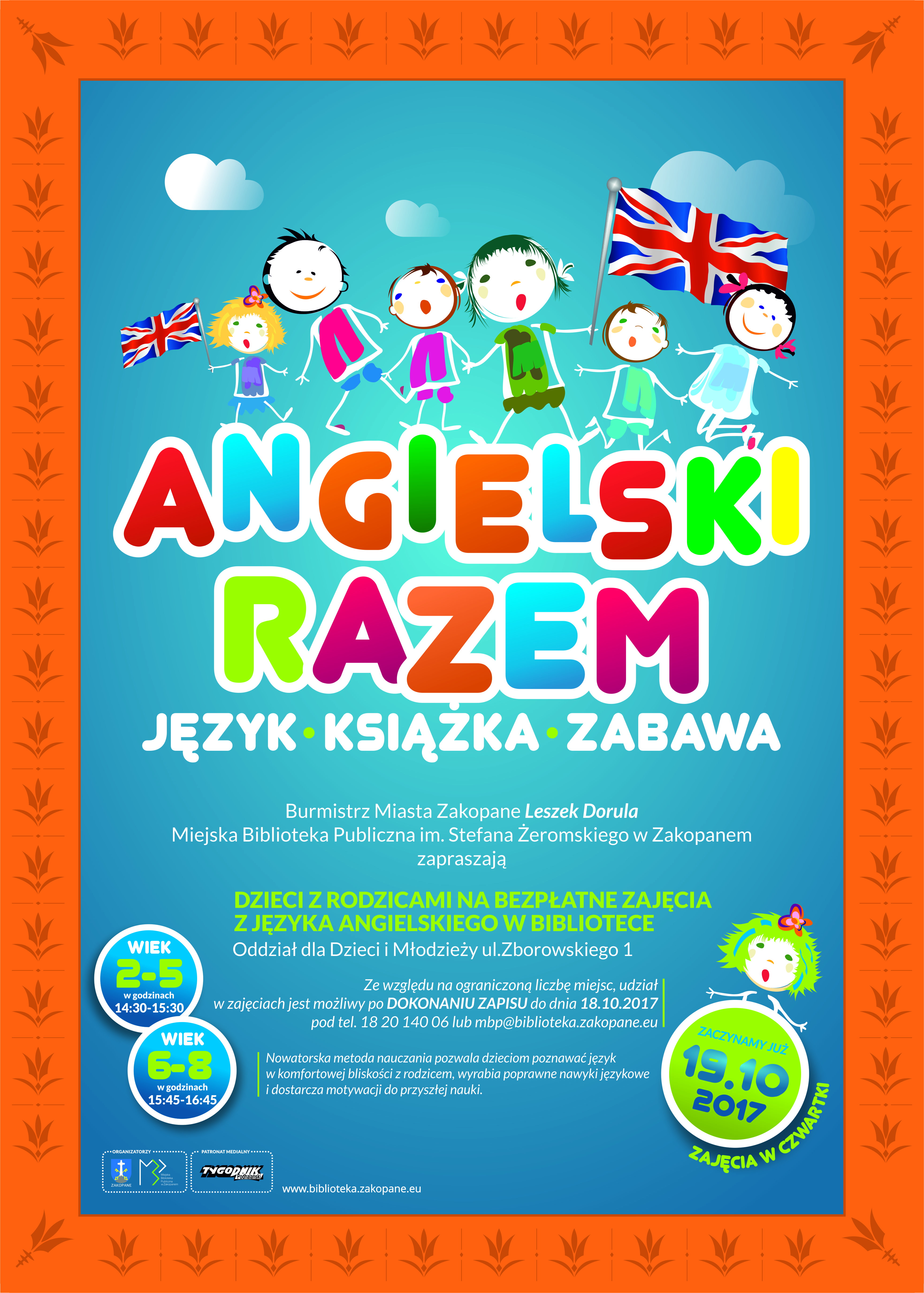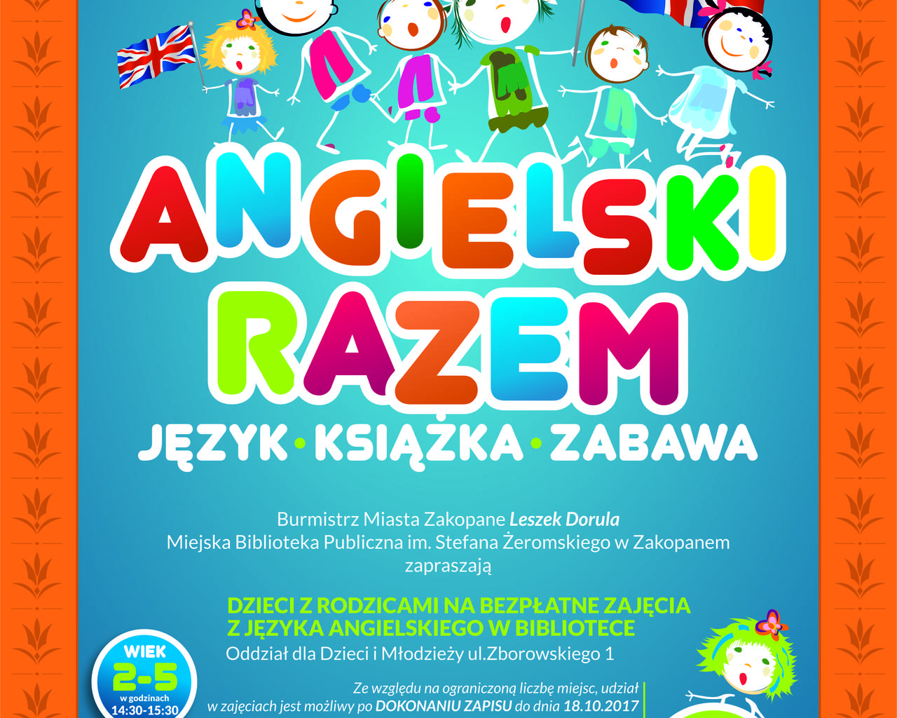Burmistrz Miasta Zakopane Leszek Dorula i Miejska Biblioteka Publiczna im. Stefana Żeromskiego w Zakopanem zapraszają dzieci z rodzicami na bezpłatne zajęcia z języka angielskiego w Bibliotece, Oddział dla Dzieci i Młodzieży, ul. Zborowskiego 1.