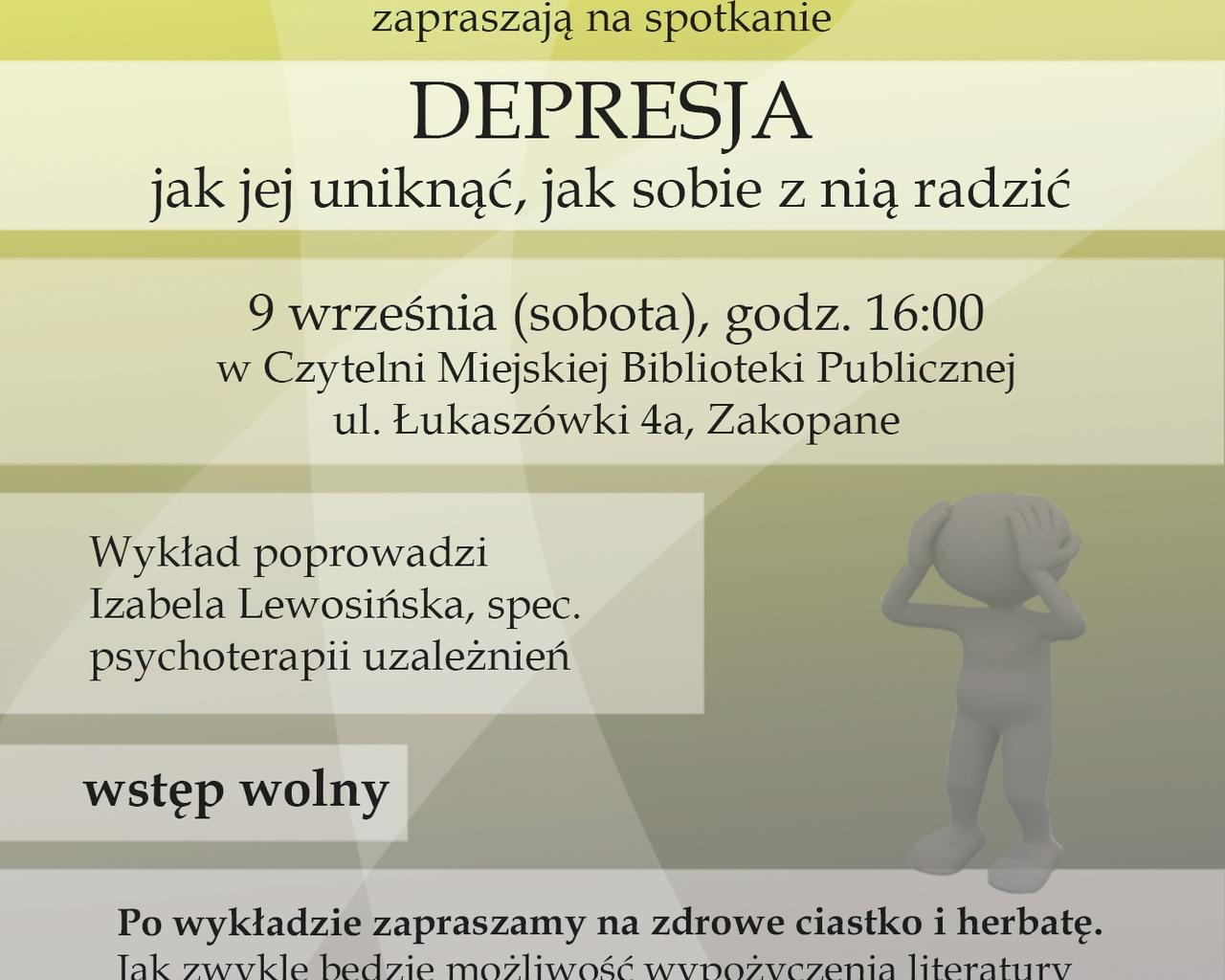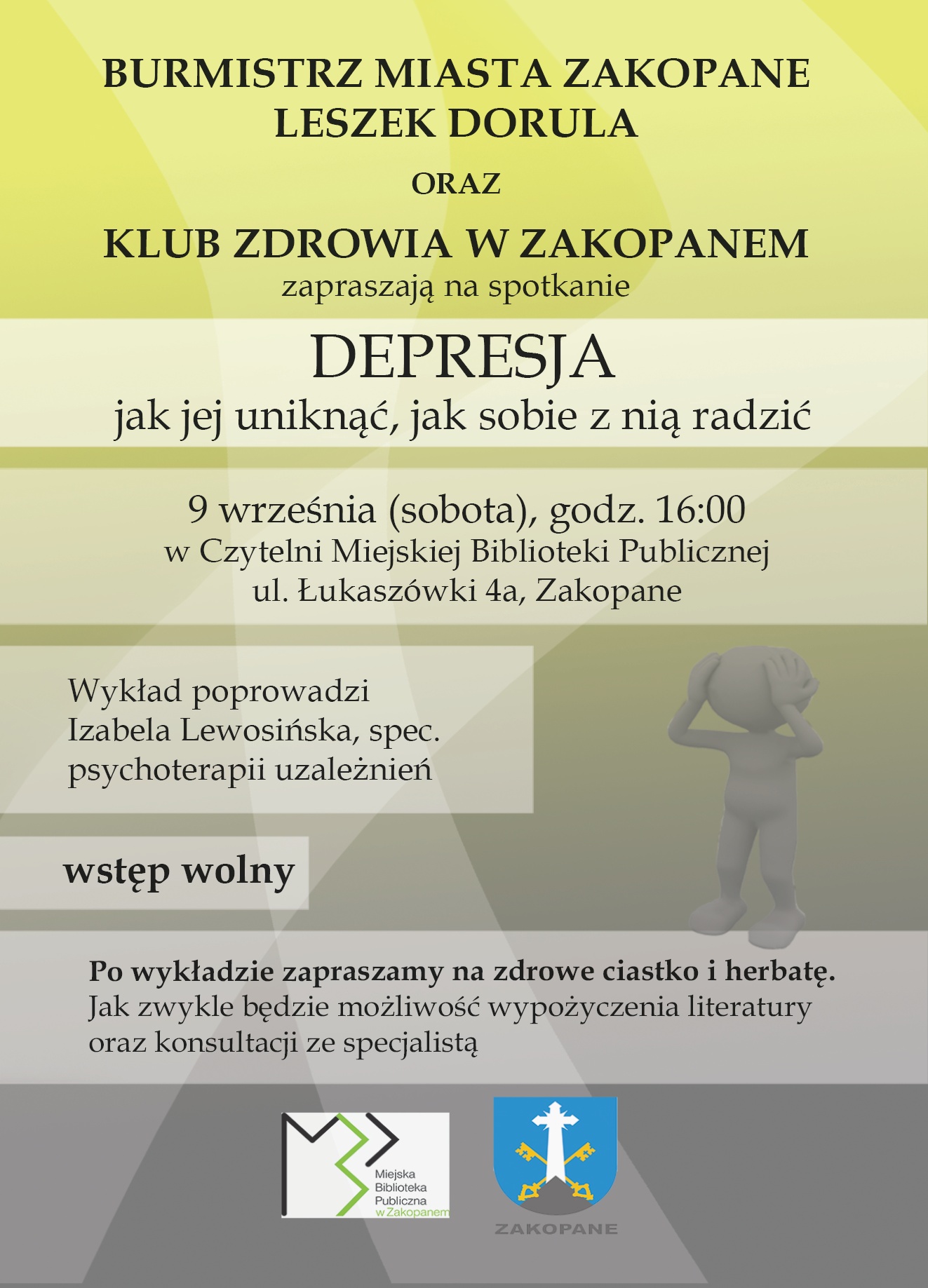 Burmistrz Miasta Zakopane Leszek Dorula oraz Klub Zdrowia w Zakopanem zapraszają na spotkanie „Depresja: jak jej uniknąć, jak sobie z nią radzić”, które odbędzie się 9 września o godz. 16:00 w Czytelni Miejskiej Biblioteki Publicznej, ul. Łukaszówki 4a. Wykład poprowadzi Izabela Lewosińska, specjalista psychoterapii uzależnień. Wstęp wolny.