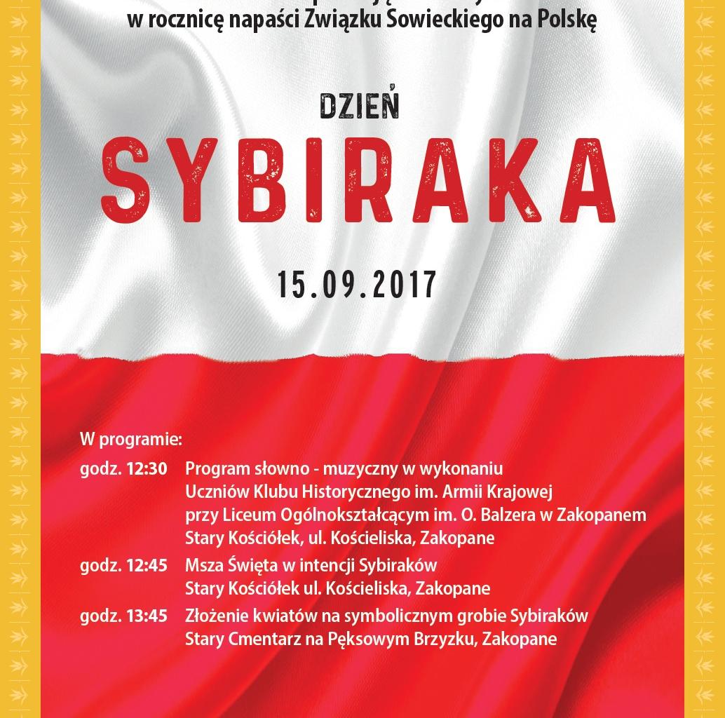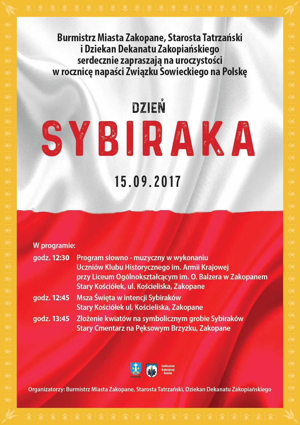 Burmistrz Miasta Zakopane, Starosta Tatrzański i Dziekan Dekanatu Zakopiańskiego serdecznie zapraszają na obchody Dnia Sybiraka w dniu 15.09.2017r.