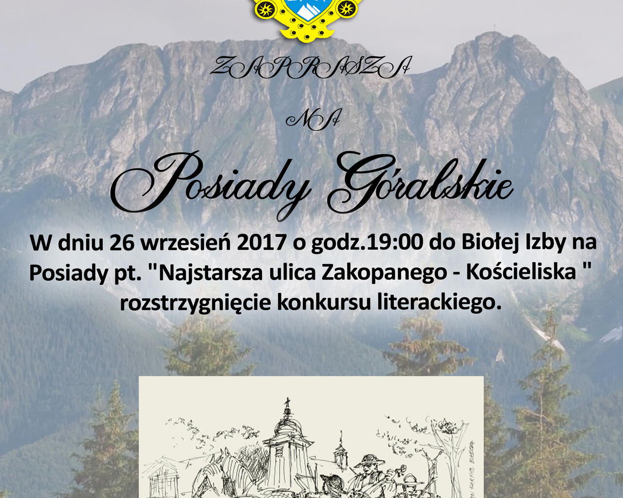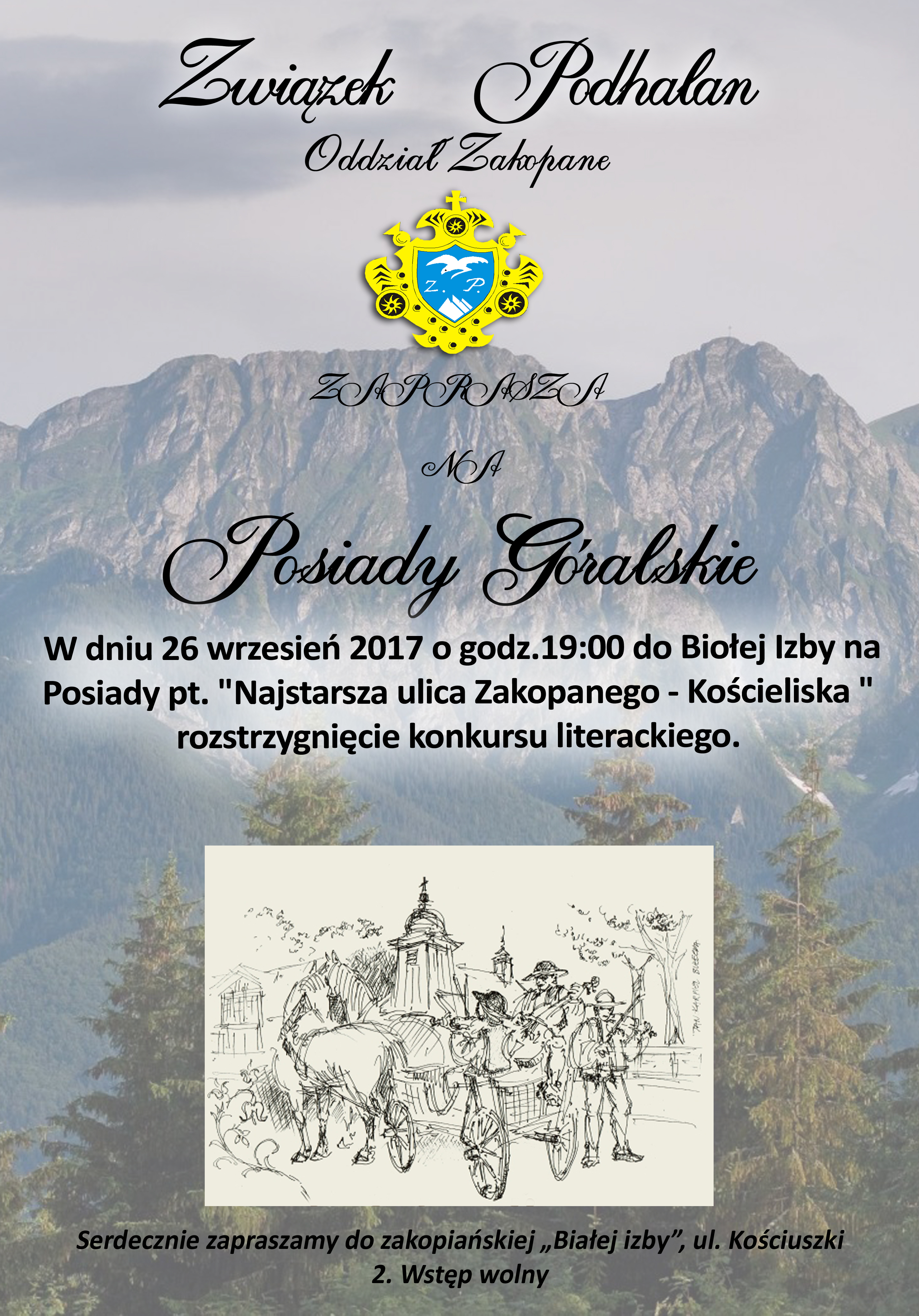 Związek Podhalan Oddział Zakopane serdecznie zaprasza 26 września 2017 o godz.19:00 do Biołej Izby na Posiady pt. "Najstarsza ulica Zakopanego - Kościeliska" - rozstrzygnięcie konkursu literackiego.