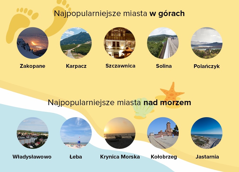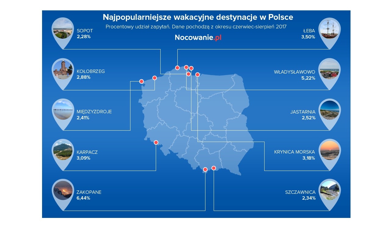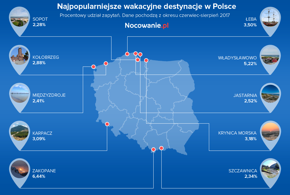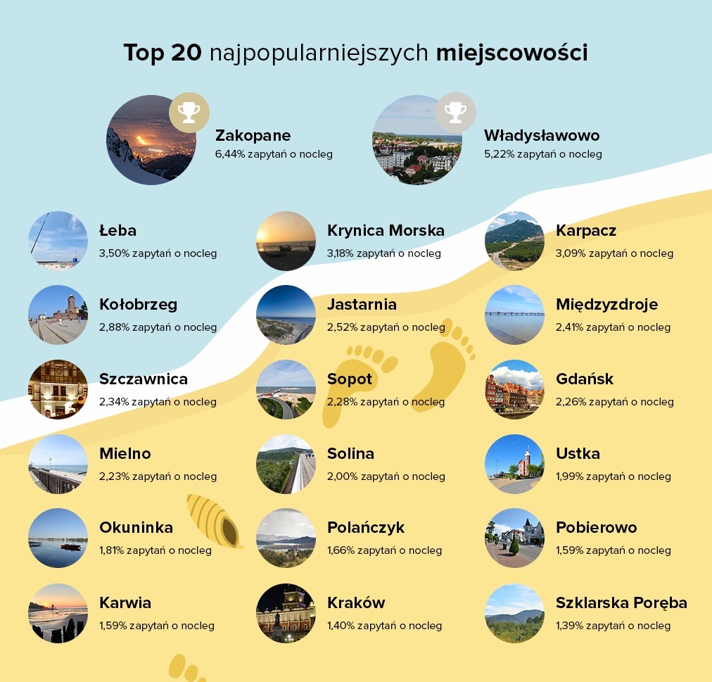 Od czerwca do sierpnia bieżącego roku najchętniej wybieraną miejscowością było Zakopane (ponad 6% wszystkich zapytań). Wśród najpopularniejszych miejscowości dominowały znane kurorty nadmorskie oraz miejscowości górskie. Rzadziej wybierane były duże aglomeracje miejskie. Na kolejnych pozycjach zestawienia najpopularniejszych miejscowości znajdziemy Władysławowo (5,22%), Łebę (3,5%), Krynicę Morską (3,18%), na piątej pozycji znalazł się Karpacz (3,09%). Wśród miejsc, które zadebiutowały w top 20 w 2017 roku są Okuninka nad Jeziorem Białym, Kraków i Szklarska Poręba.