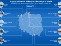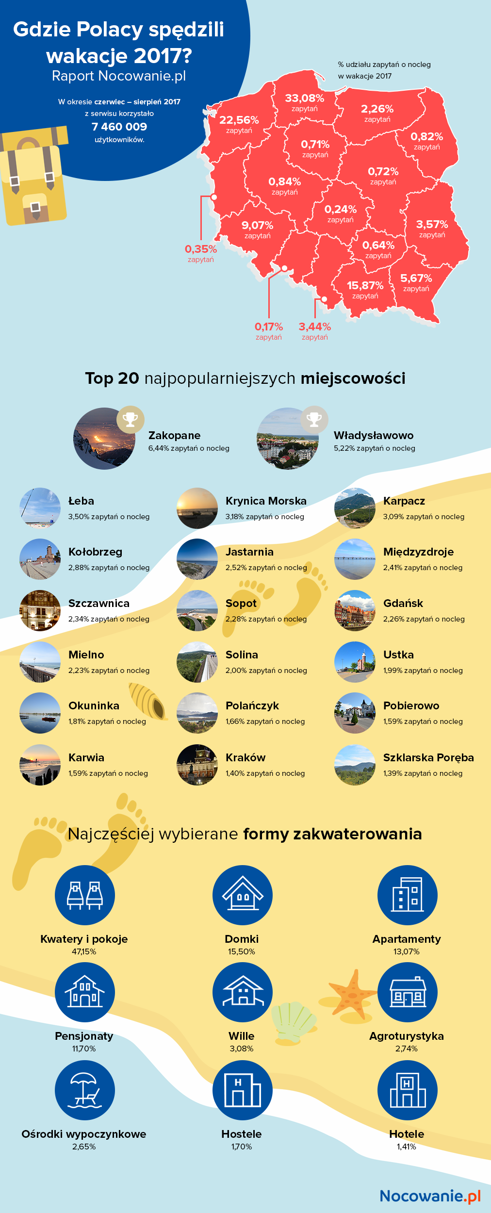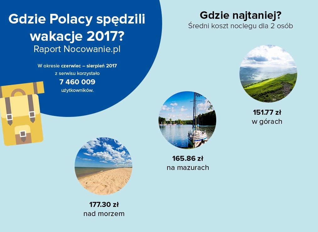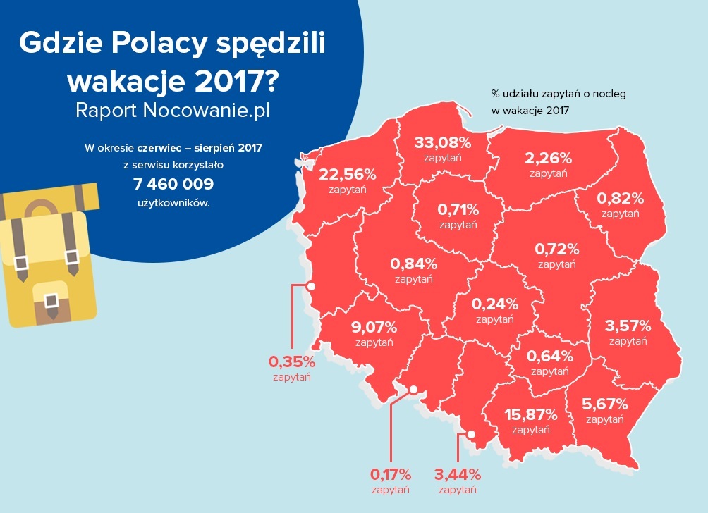 Portal internetowy Nocowanie.pl przyjrzał się preferencjom turystycznym Polaków. Dokładnej analizie poddał okres wakacyjny i miejsca destynacji urlopowych. Sprawdził, gdzie Polacy poszukiwali noclegu w letnich miesiącach, uwzględniając dane pochodzące z serwisu Nocowanie.pl w okresie czerwiec – sierpień 2017. W tym czasie z serwisu korzystało blisko 7,5 mln użytkowników.
