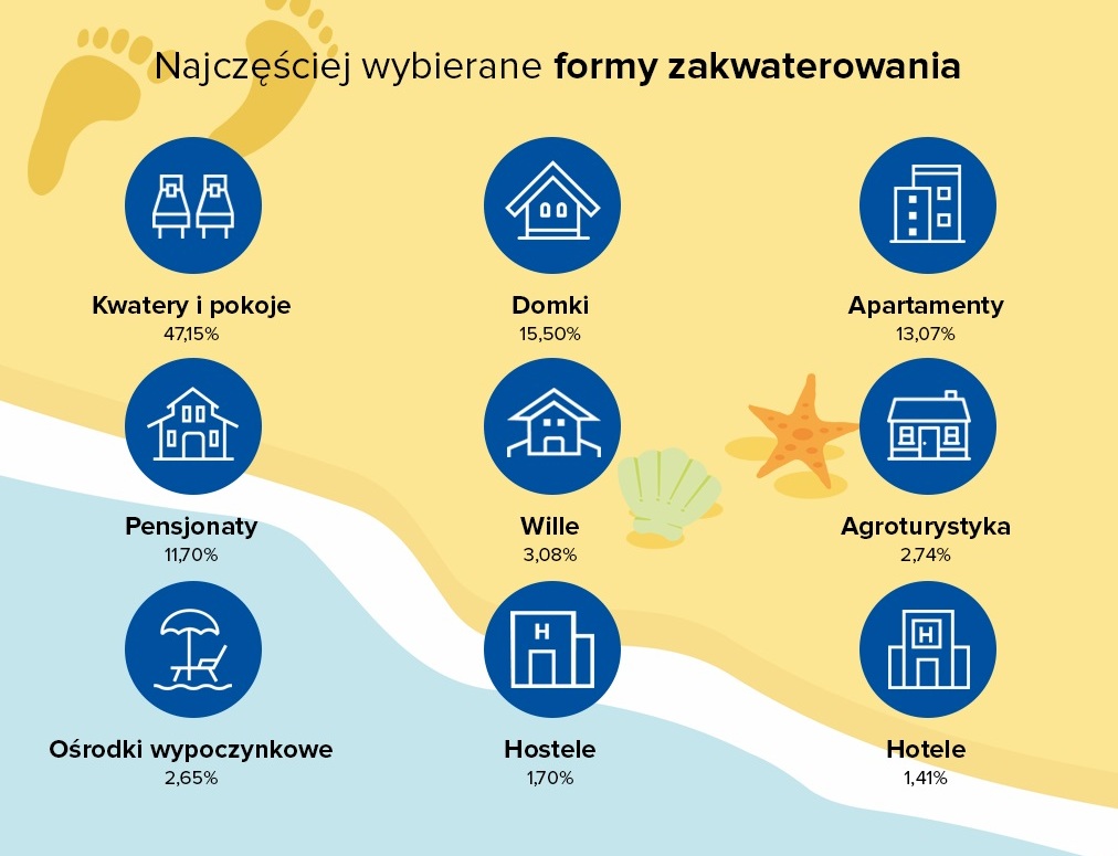 Wśród najczęściej wybieranych form zakwaterowania znalazły się kwatery i pokoje (47%), podobnie było również w roku ubiegłym. W tym roku turyści częściej wybierali domki (15%) i apartamenty (13%), ale pensjonaty również znalazły się wysoko.