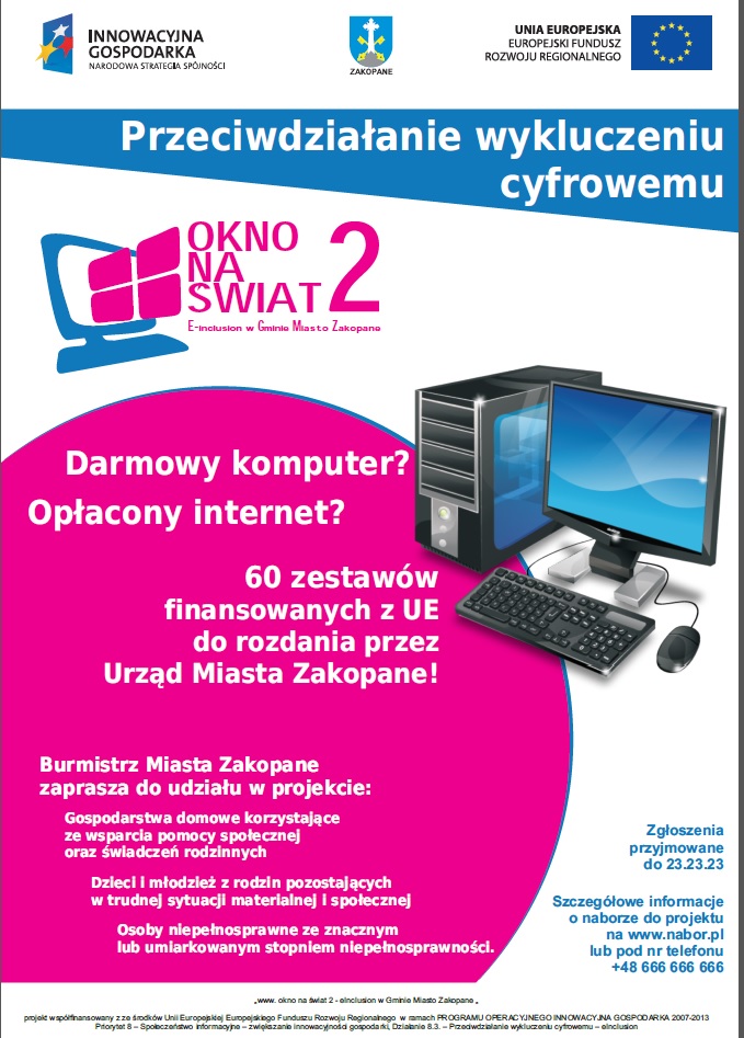 W obecnych czasach Internet jest oknem na świat. Daje szansę na dostęp do wiedzy, niesie informacje z różnych dziedzin, w tym i możliwości wyszukania ofert pracy, kształcenia, stałego podnoszenia swoich kwalifikacji. Po sukcesie pierwszej edycji „okna na świat” Gmina Miasto Zakopane zrealizuje II edycję projektu.